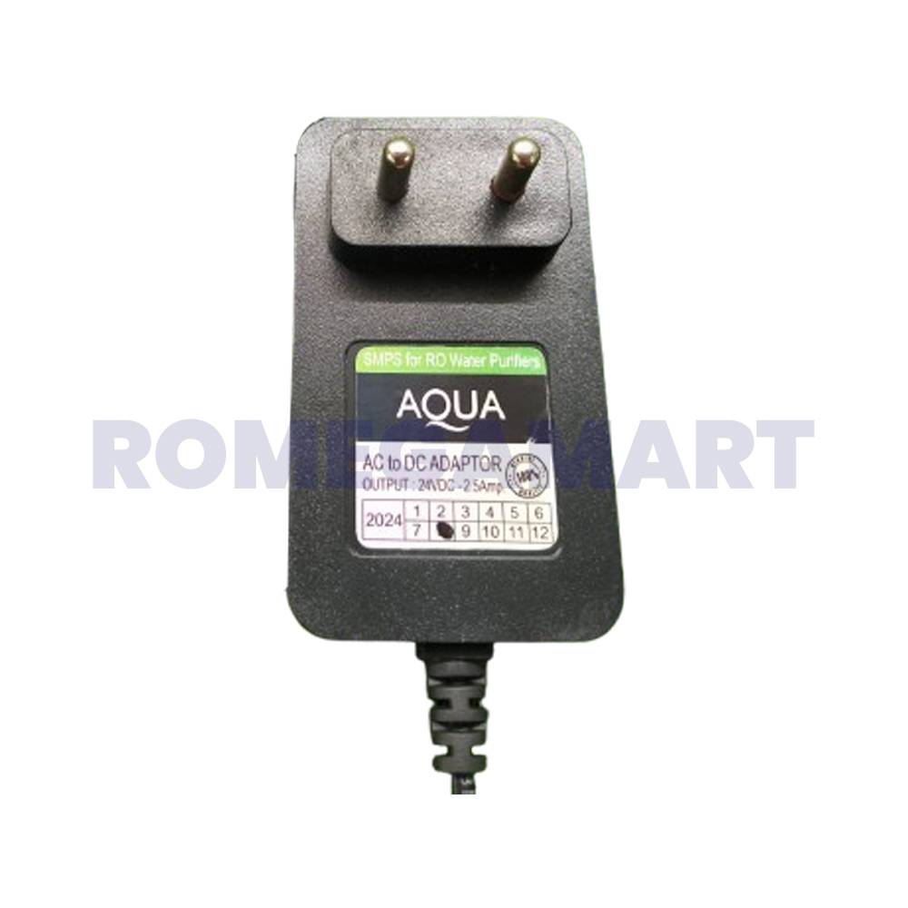 The 24V Aqua 2.5 Ampere AC/DC Adapter in black color is designed to provide stable and efficient power for various electronic devices, commonly used in water filtration systems such as RO purifiers and other small appliances.