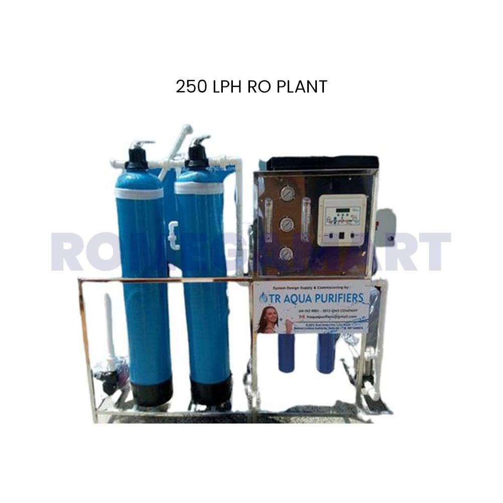 The 250 LPH RO Plant in blue color is built with FRP material for durability and efficiency. Designed for industrial use, it features automatic operation for hassle-free performance. This high-capacity reverse osmosis system ensures pure and safe water by removing impurities, contaminants, and dissolved solids. Ideal for factories, hospitals, and commercial establishments, it guarantees a steady supply of clean water.