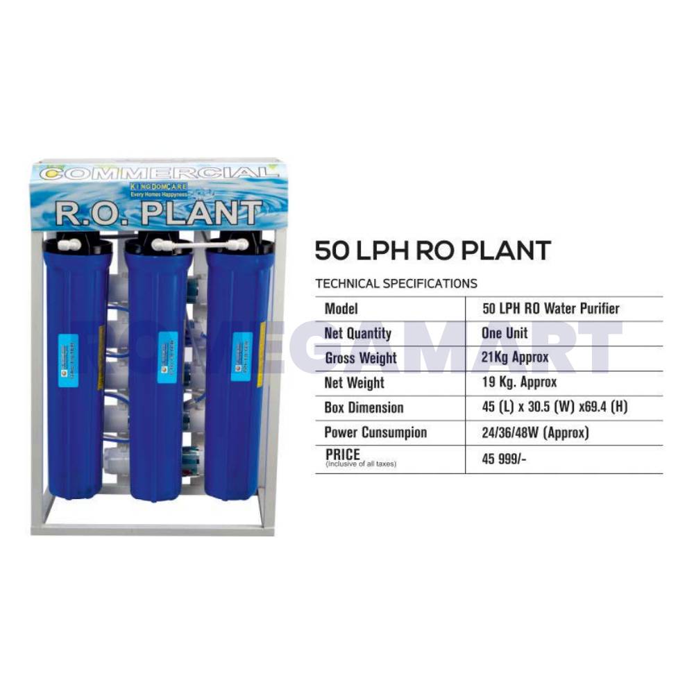 The 50 LPH Commercial RO Plant in blue FRP material is the perfect solution for high-volume water purification needs. Designed for commercial use, this robust system delivers 50 liters per hour of clean, safe, and mineral-rich water. The durable FRP body ensures long-lasting performance and resistance to corrosion. Ideal for offices, restaurants, and industrial setups, this RO plant combines efficiency, reliability, and modern design.K