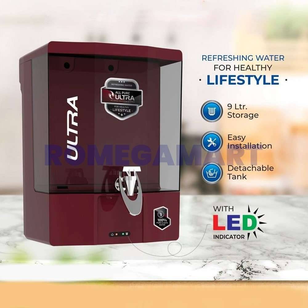 The All Pure Ultra 9-Liter Domestic RO Water Purifier in metallic cheery exudes elegance and functionality for your water purification needs. Crafted with a food-grade ABS plastic body, this Water Purifier ensures the safety and purity of your drinking water. With a spacious 9-liter capacity, it guarantees a constant supply of clean and purified water for your household. The metallic Cheery color adds a modern and sophisticated touch to your kitchen, making the All Pure Ultra a reliable and aesthetically pleasing choice for enhancing water quality in your home.
