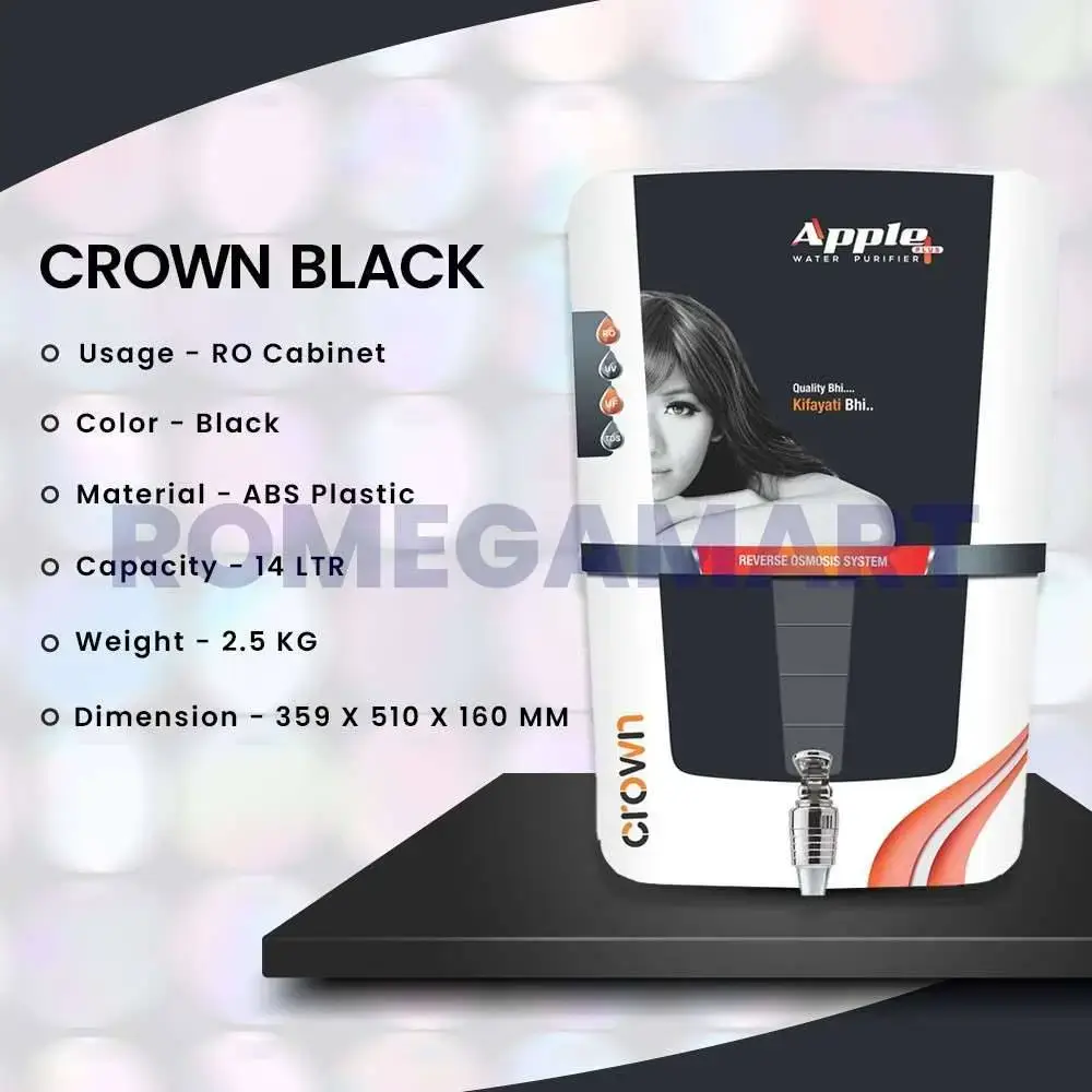 The Apple Plus CROWN Black Domestic RO Water Purifier is a reliable and efficient solution for home water purification. It features a 14-liter storage capacity and is constructed from durable ABS plastic material. This RO water purifier ensures the delivery of clean and safe drinking water, making it an ideal choice for households. The stylish blue design adds a modern touch to any kitchen.