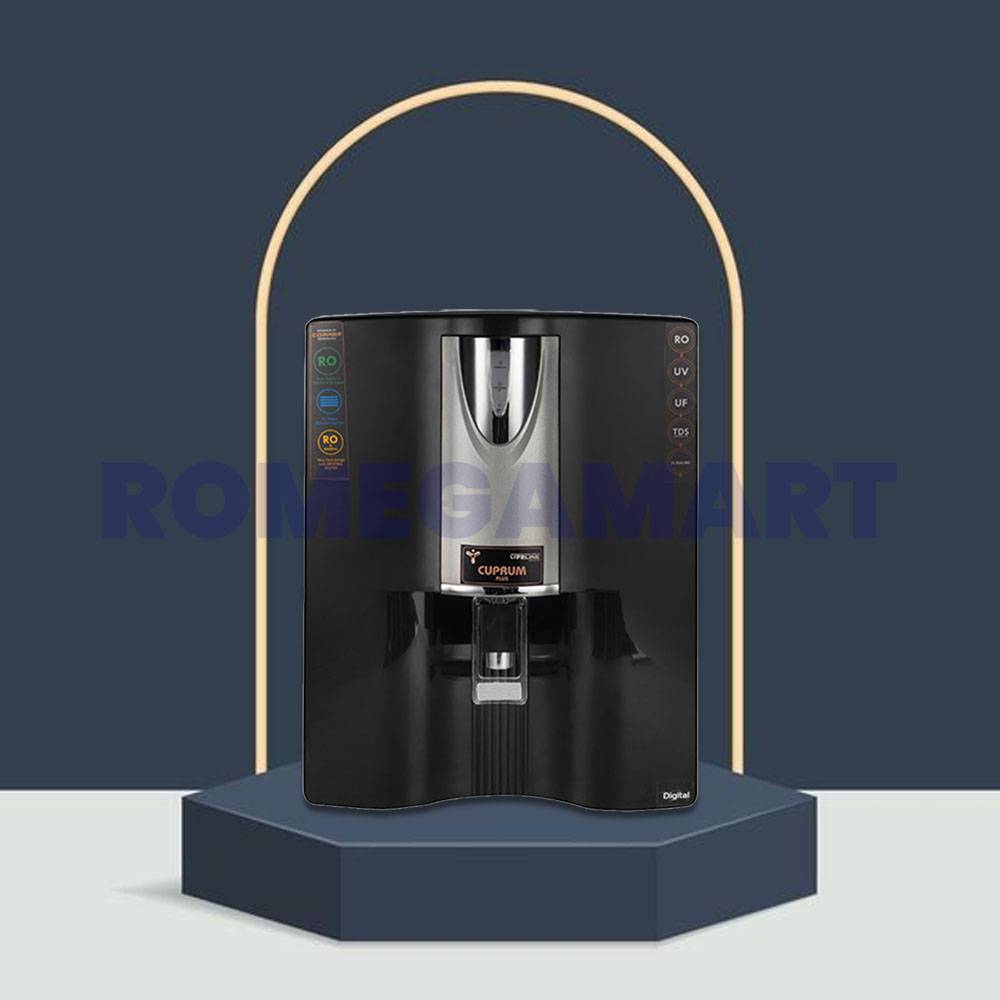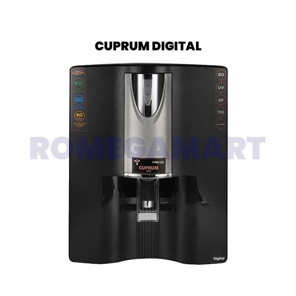 The Cuprum Digital Black Water Purifier is a sleek and efficient solution for modern households. Featuring a 10-liter storage capacity, it ensures a continuous supply of pure and safe drinking water. Designed with advanced RO+UV+TDS control technology, it effectively eliminates impurities, harmful microorganisms, and contaminants while retaining essential minerals. Its elegant black finish complements any kitchen décor, offering both style and functionality. The purifier is built with durable, food-grade materials, ensuring safety and longevity. Its user-friendly digital display provides real-time updates on water quality and filter life, making maintenance hassle-free. Ideal for families, it delivers convenience and health in one compact unit.