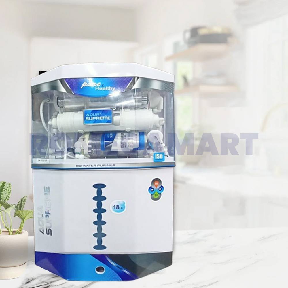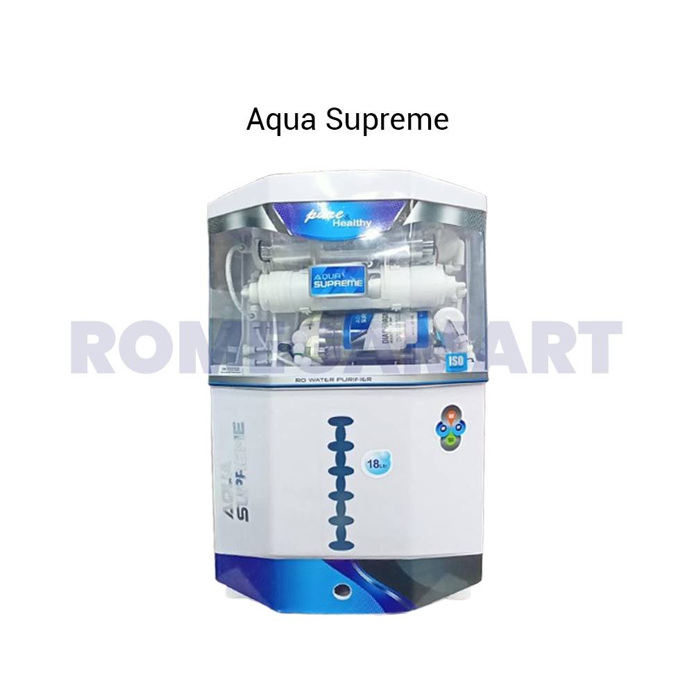 The Aqua Supreme Water Purifier features a sleek white body with a transparent design and an 18-liter storage capacity, perfect for large households. Manufactured by M/S Chand Enterprises, it ensures high-quality water purification, providing safe and pure drinking water. Its modern design complements any kitchen interior while offering efficient performance.