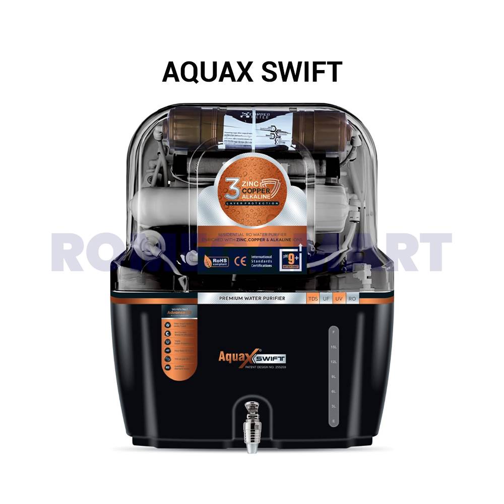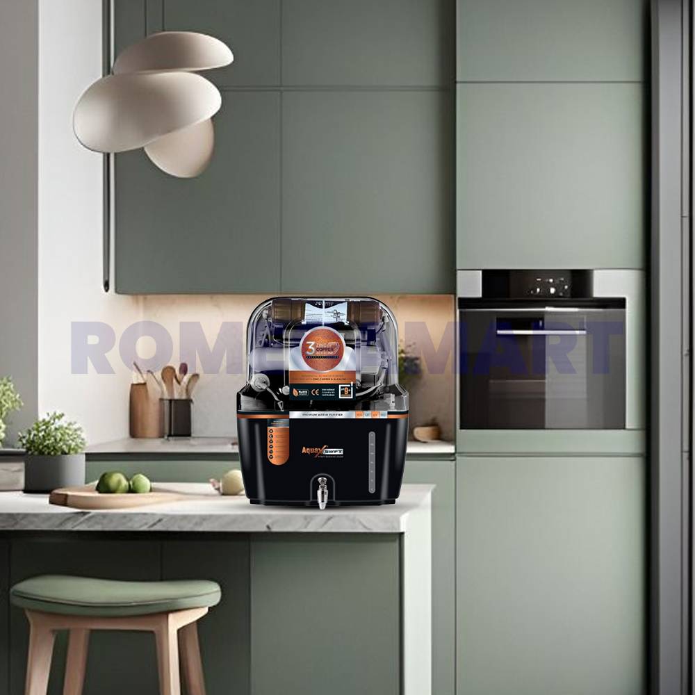 Experience pure and safe drinking water with the Aqua X Swift 12 Liter Storage Water Purifier. Designed for domestic use, this sleek black transparent purifier combines advanced purification technology with a generous 12-liter storage capacity. Its modern design adds a touch of elegance to your kitchen while ensuring your family always has access to clean, safe water. Durable and easy to maintain, it's the perfect blend of style and functionality.