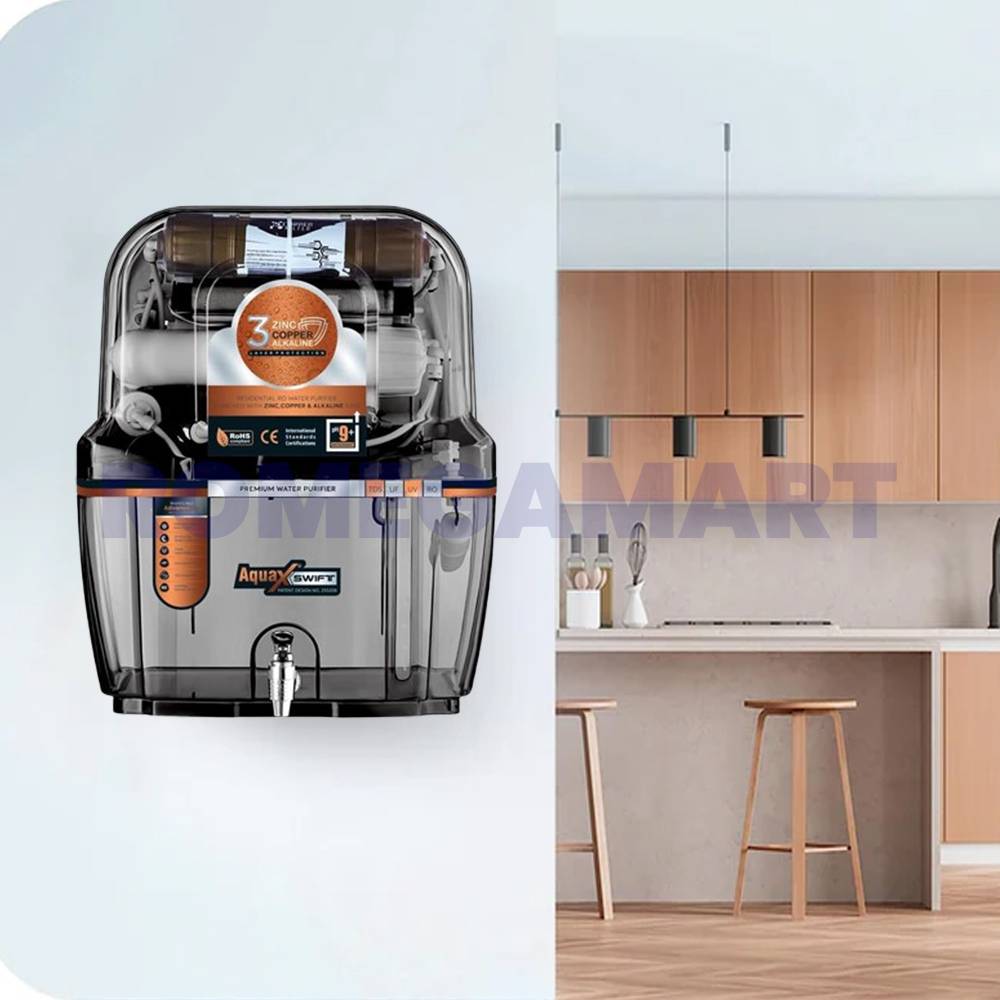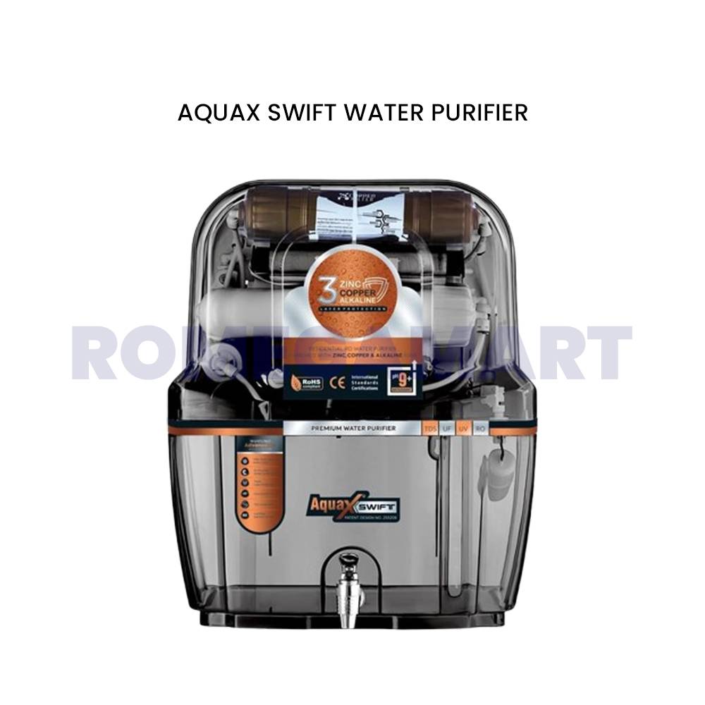 The Aquax Swift Grey Transparent Water Purifier combines advanced RO, UV, UF, and Mineral Cartridge technologies to provide purified, healthy drinking water. With its TDS controller, it ensures optimal mineral retention while enhancing water taste. The grey transparent design adds a modern, sleek touch to your kitchen, offering both style and superior purification.