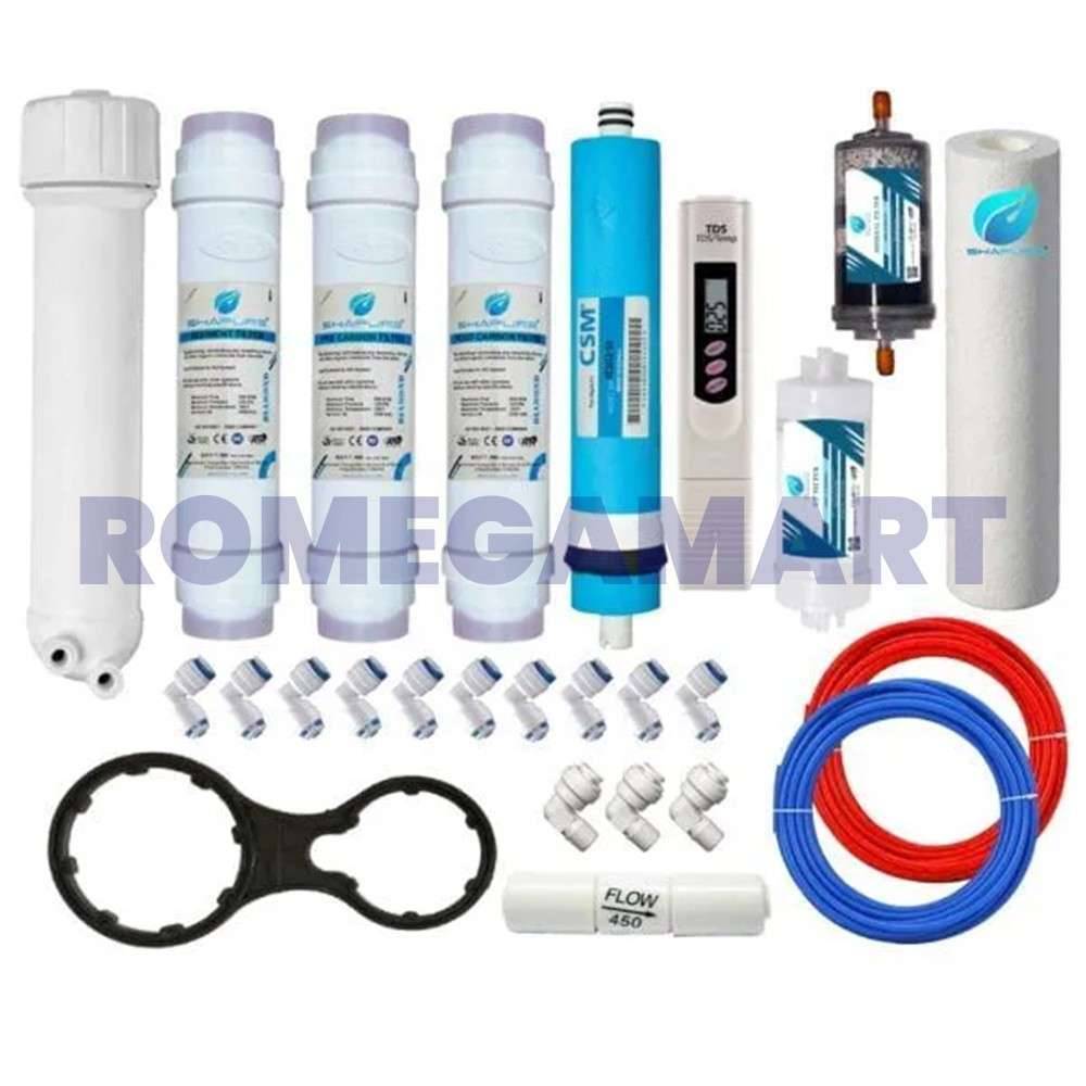| Included Components | 1 pcs 80 GPD CSM Membrane, 1 pcs carbon,1 pcs post carbon, 1 sediment, 1 pcs Mineral 4 inch, 1pcs UF filter, 1 pcs TDS Meter, 1pcs spun, 8 Push fit connectors, 1 Teflon tape, 1 spanner, 3 Meter pipe each (BLUE & RED), 1 pcs flow restrictor (FR 450ml) |