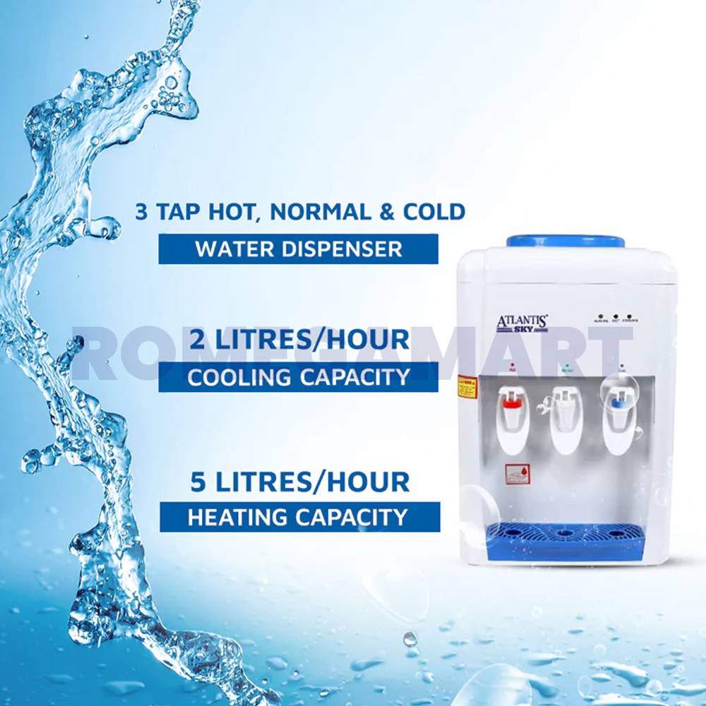 The Atlantis Sky Hot, Normal & Cold Table Top Water Dispenser is a versatile and compact solution for dispensing water at the perfect temperature. Featuring three taps for hot, normal, and cold water, it’s ideal for preparing tea, coffee, or refreshing drinks. Designed for tea and coffee vending services, this sleek table-top dispenser fits perfectly in homes, offices, and commercial spaces. With its durable build and efficient performance, the Atlantis Sky ensures convenience, reliability, and easy access to hydration.