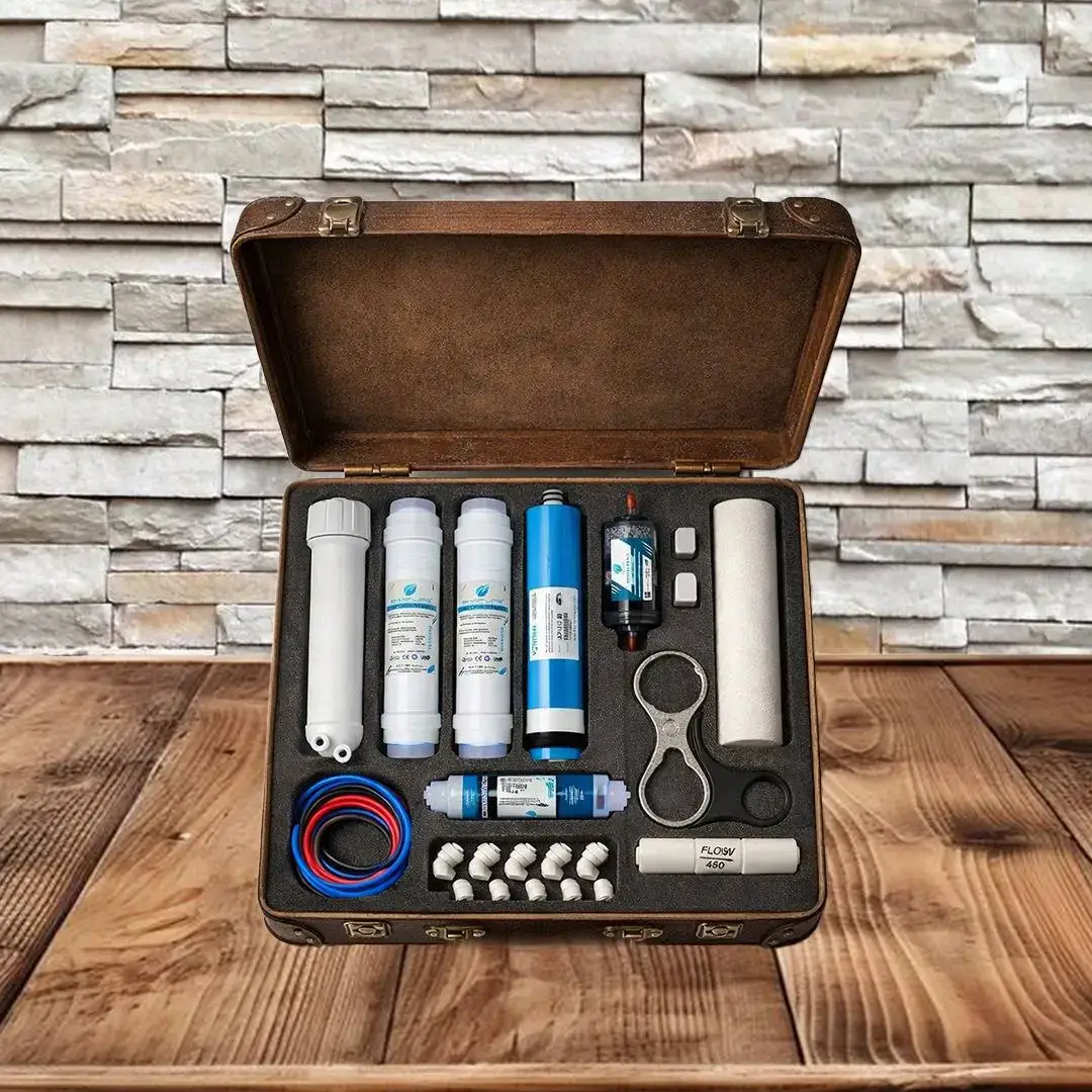 | Included Components | 1 pcs 80 GPD Vontron Membrane, 1 pcs carbon,1 pcs post carbon, 1 sediment, 1 pcs Mineral 4 inch, 1pcs UF filter, 1 pcs TDS Meter, 1pcs spun, 8 Push fit connectors, 1 Teflon tape, 1 spanner, 3 Meter pipe each (BLUE & RED), 1 pcs flow restrictor (FR 450ml) |