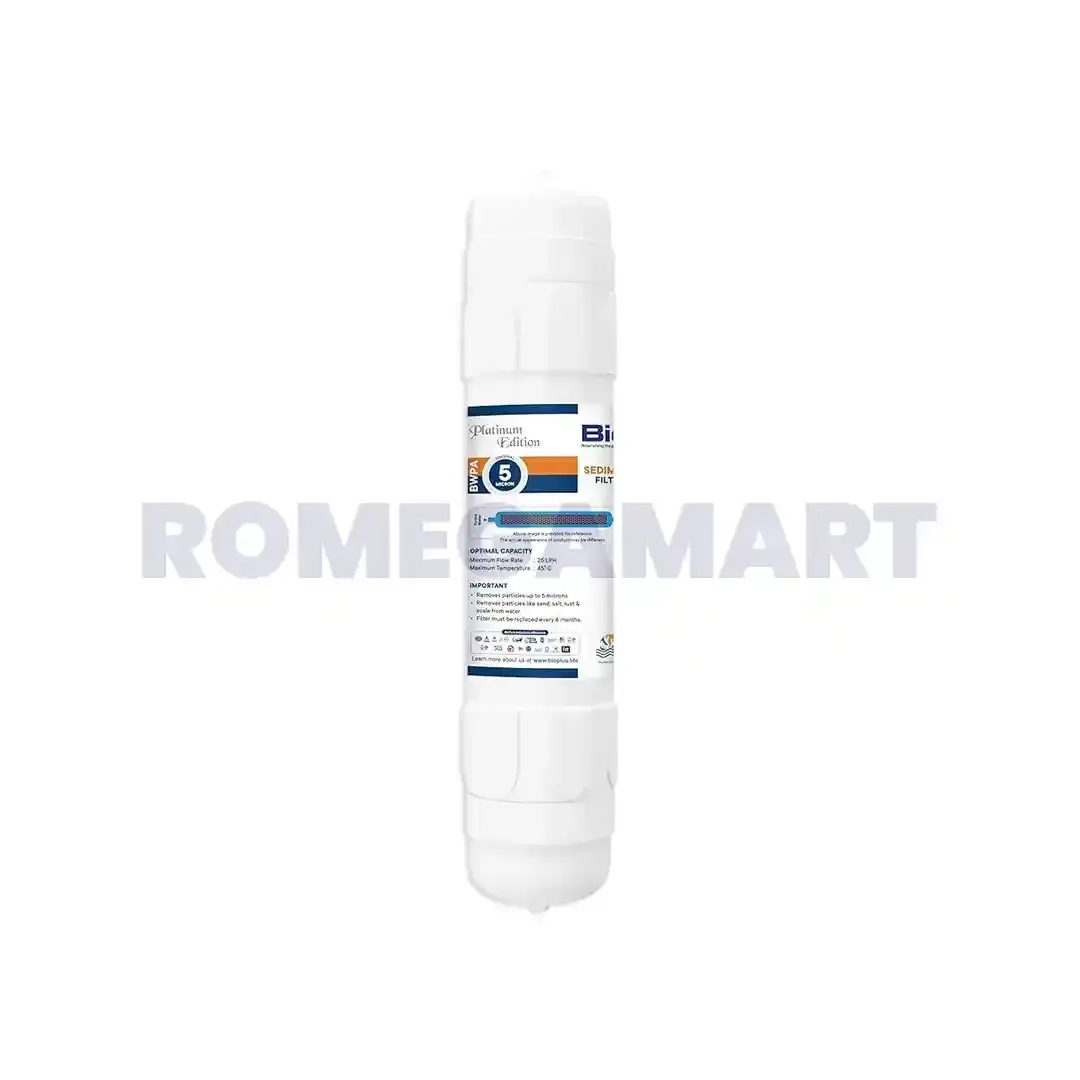 The Bio+ Platinum Edition Sediment Filter is a high-performance pre-filter designed to protect your RO system and improve overall water quality. Made with durable white plastic material, this filter effectively removes dust, sand, rust, and other fine particles from your water supply. Ideal for domestic use, it enhances the lifespan of membranes, pumps, and other internal components of your purifier.