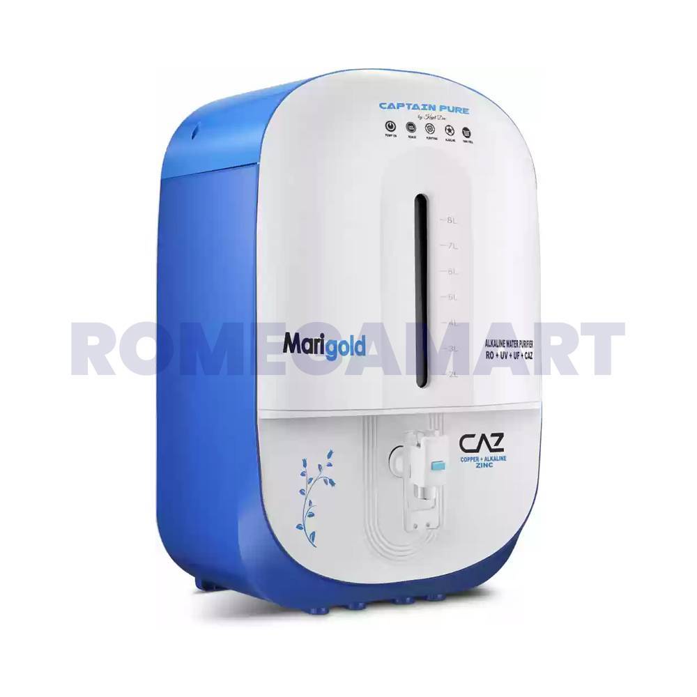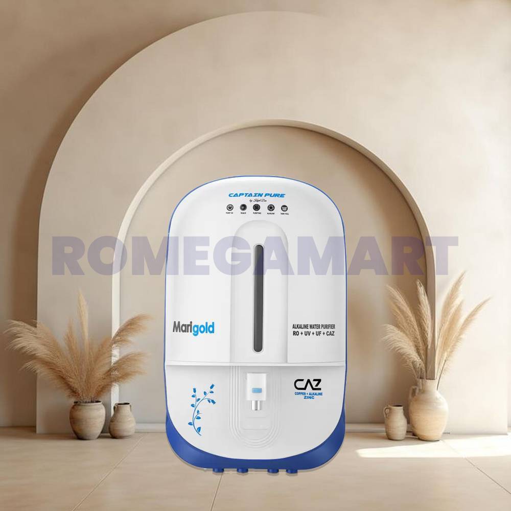 Captain Pure Marigold is a 9-liter advanced water purifier featuring RO, UV, UF, Alkaline, and CAZ technologies for complete water purification. Its white color body gives it a clean, modern look suitable for any kitchen or office. It ensures healthy, mineral-rich drinking water with every sip. Designed for purity, performance, and style—ideal for today’s health-conscious users.