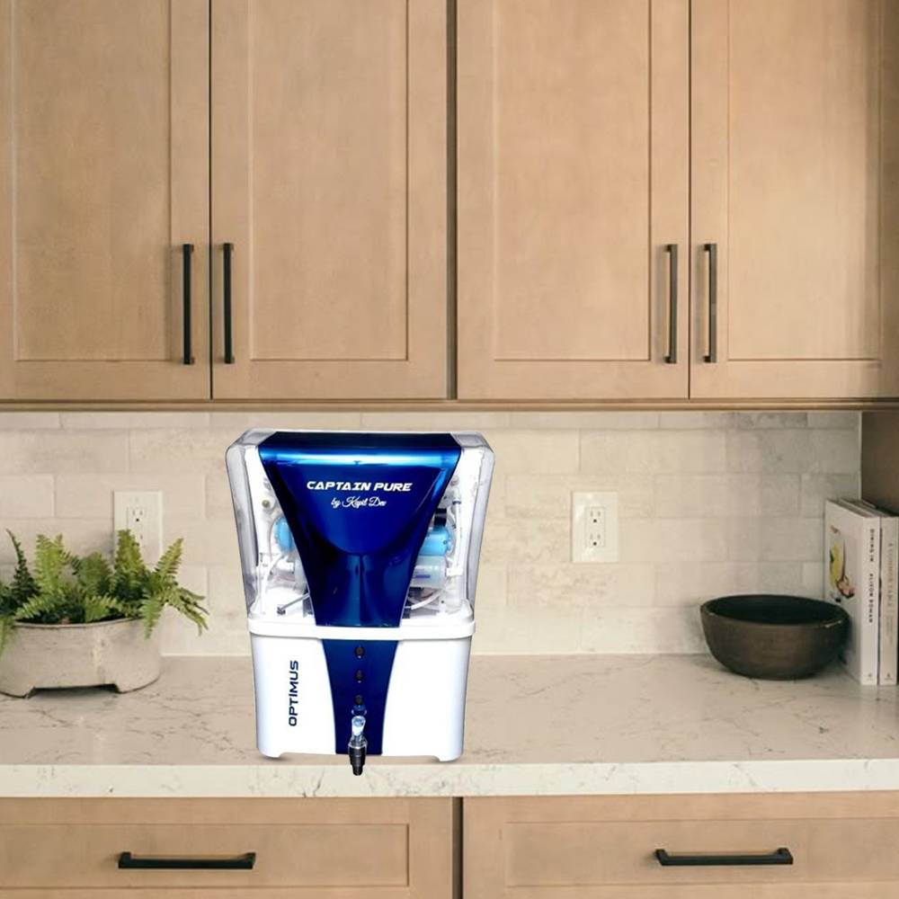 The Captain Pure Optimus by Mountain Water Purifier Technology is a high-performance water purifier with a stylish white body and blue TPT finish. Featuring a 12-liter storage capacity, it ensures safe, purified water with advanced filtration technology. Ideal for homes and offices, it provides reliable and efficient water purification with a modern design.