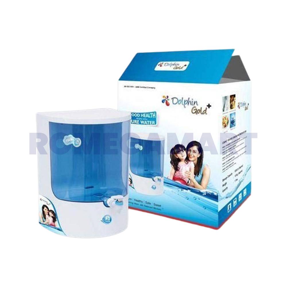 Ensure safe and clean drinking water at home with the Dolphin Gold+ 9 Liter Storage Water Purifier. Featuring an elegant white and blue design, this purifier is perfect for domestic use. With advanced purification technology and a 9-liter storage capacity, it provides your family with pure water anytime. Its compact and stylish design fits seamlessly into any kitchen space, combining performance with aesthetic appeal.