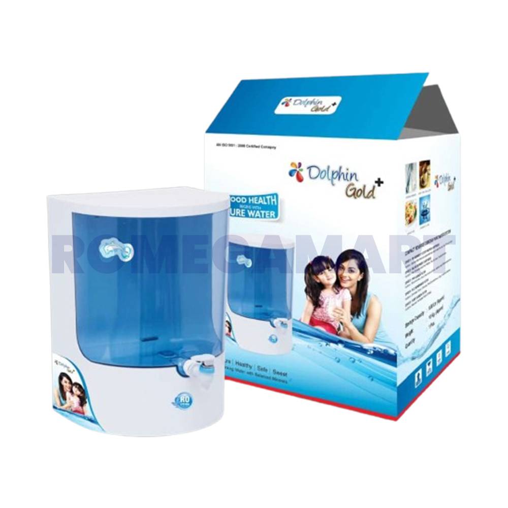 The Dolphin Gold+ Water Purifier features a vibrant blue transparent design with a 9-liter storage capacity, ideal for domestic use. Manufactured by M/S Chand Enterprises, this purifier ensures clean, safe, and healthy drinking water with advanced filtration technology, offering both functionality and style.