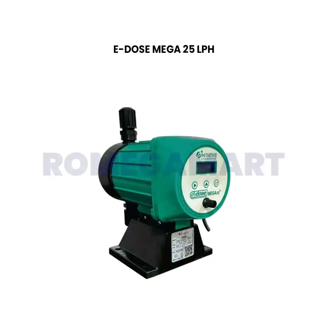 The E Dose Mega 25 LPH Dosing Pump Green Color Polypropylene Material for Industrial Use is a high-performance metering pump designed for accurate and reliable chemical dosing in industrial water treatment systems. Constructed from premium-grade polypropylene, it offers superior corrosion resistance, long operational life, and leak-free performance. Ideal for RO plants, wastewater treatment, and chemical industries, this dosing pump ensures precise flow control, easy maintenance, and consistent dosing accuracy for demanding industrial applications.