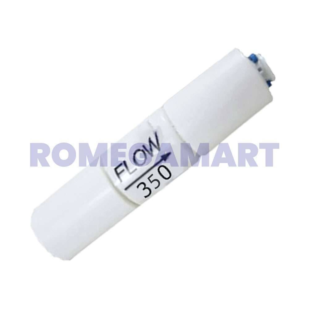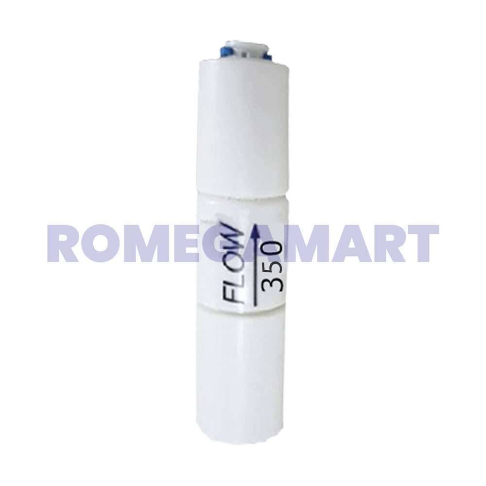 The Flow Restrictor 350 in white, crafted from food-grade plastic, is designed to regulate water flow in domestic systems. Its high-quality material ensures durability and safety for potable water applications. With precise flow control, it helps optimize water pressure, improving the efficiency and longevity of your RO system. Ideal for residential use, this restrictor maintains a steady water flow, preventing excessive pressure that can damage system components. Its compact design fits seamlessly into existing setups, making it a practical choice for enhancing water purification and distribution. Reliable and easy to install, it’s a valuable addition to any home water system.
