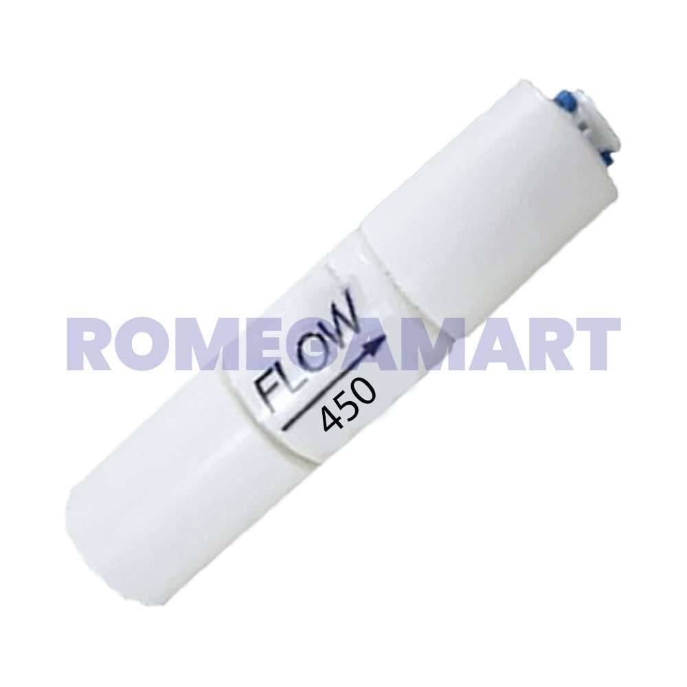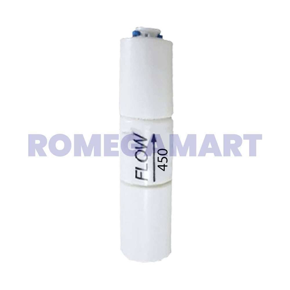 The Flow Restrictor 450 is a high-quality, white color component made from food-grade plastic, designed for domestic use. Each pack contains 5 pieces, ensuring you have ample supply for your water filtration system. This flow restrictor is engineered to maintain optimal water flow while effectively controlling the pressure within your system, enhancing the performance and longevity of your water purifier. Its durable plastic construction ensures resistance to wear and tear, making it a reliable choice for maintaining water purity. Ideal for residential water systems, this restrictor helps in achieving efficient filtration and consistent water flow.