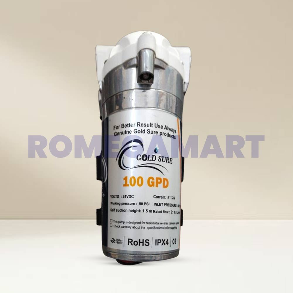 The Gold Sure 100 GPD Domestic Ro Pump is a high-performance water pump designed for domestic use, offering a flow rate of 100 gallons per day (GPD). Its robust construction features durable aluminum material, ensuring longevity and corrosion resistance, making it suitable for everyday household water needs. With a maximum pressure rating of 90 PSI, this pump ensures efficient water transfer and pressure regulation, ideal for reverse osmosis systems and other home water filtration setups. The Gold Sure pump operates quietly, with energy efficiency as a core feature, providing reliable performance while maintaining low power consumption for optimal water use.