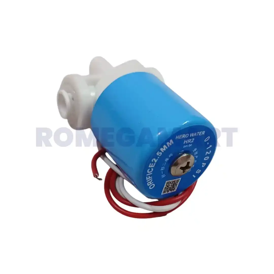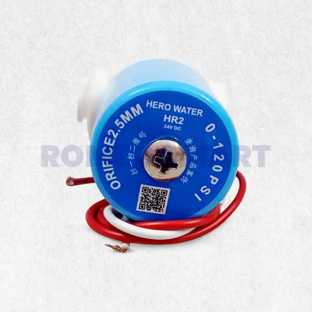 The Hero HR2 24V DC Solenoid Valve from Radha Krishna Enterprises is a premium-quality component suitable for all types of RO water purifiers. This valve efficiently controls the water flow in RO systems, ensuring reliable performance and preventing leakage. Built with durable materials, the Hero HR2 is designed to handle long-term usage and withstand regular water pressure. With its 24V DC operation, it provides smooth and energy-efficient functioning, making it ideal for domestic RO systems. Easy to install and widely compatible, the Hero HR2 solenoid valve is trusted by technicians for consistency, durability, and optimal system efficiency.