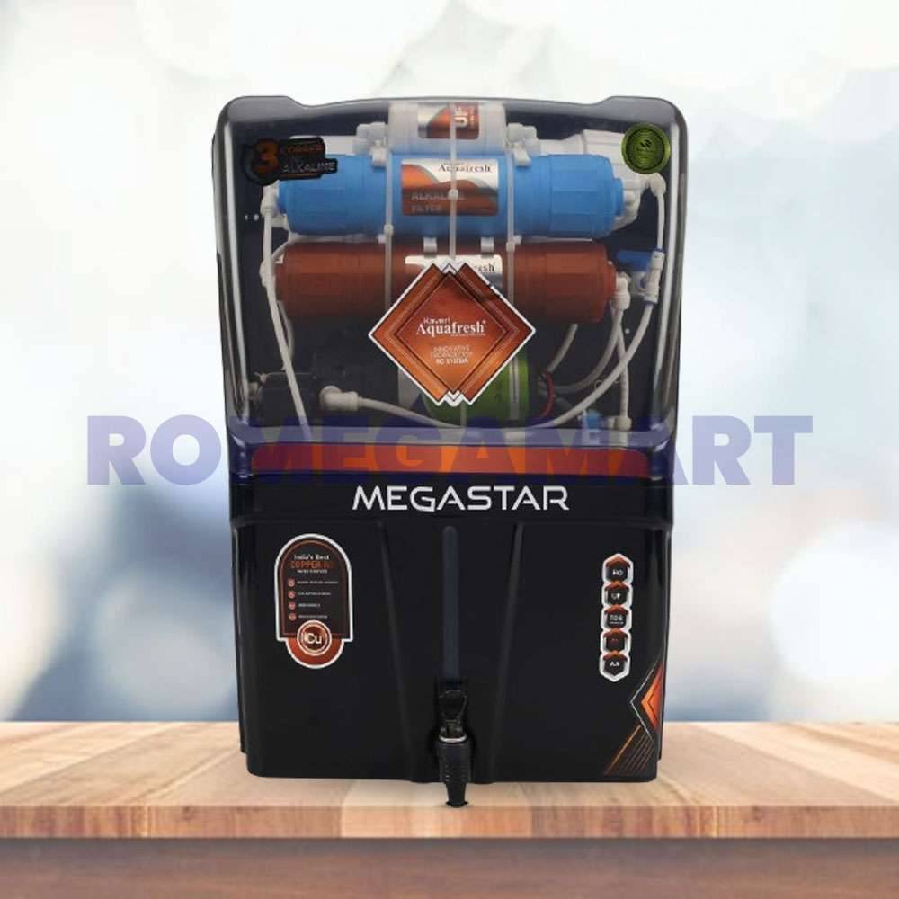 The Kaveri Megastar 12-liter storage Water Purifier Cabinet in sleek black with transparent accents is designed for efficient domestic water purification. This RO system integrates advanced filtration technologies, ensuring clean and safe drinking water. Its spacious storage capacity caters well to household needs, providing ample water for daily consumption. The transparent design adds a modern touch, allowing users to monitor water levels easily. Crafted from durable materials, it guarantees reliability and longevity. Ideal for homes seeking both functionality and style, the Kaveri Megastar offers peace of mind with its effective purification capabilities, ensuring every drop is free from impurities and contaminants.