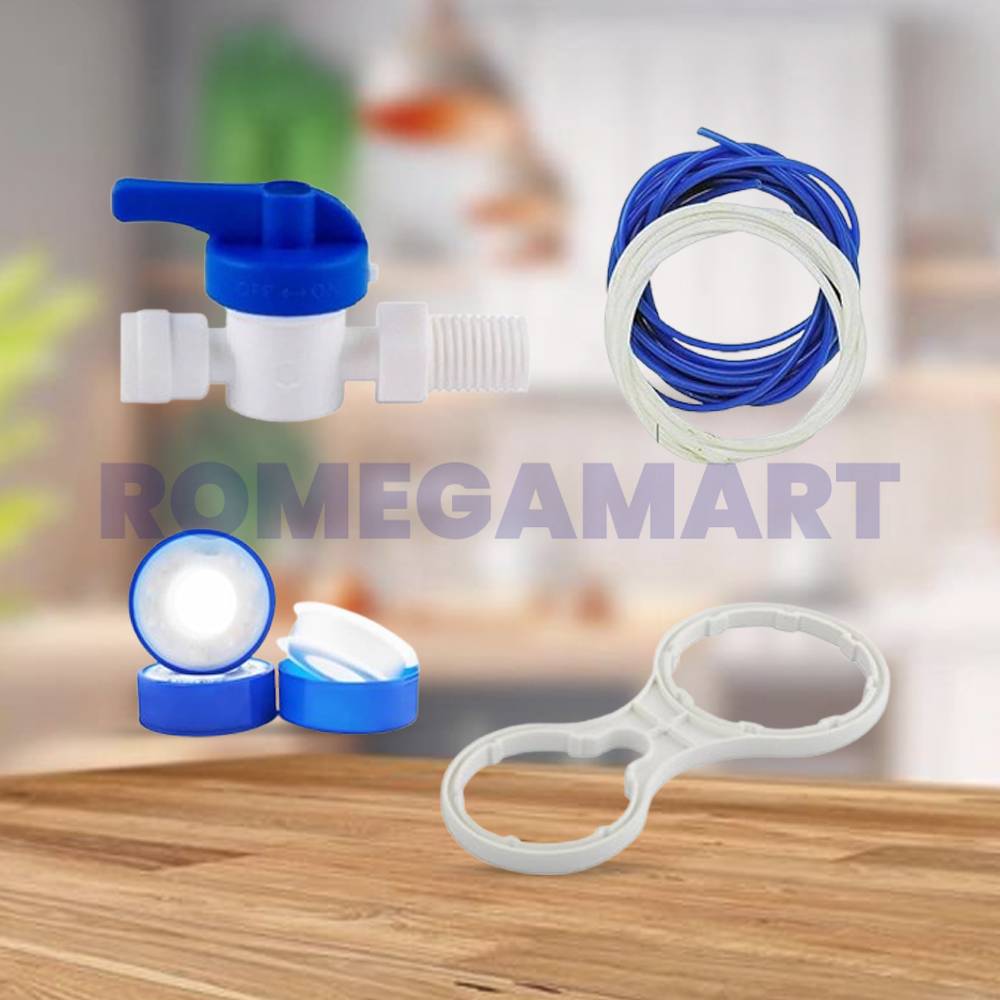 The Liv Drop Combo Set includes essential components for RO water purifiers. It features a 1/4 inch plastic inlet ball valve, 3 Teflon tape rolls, a double-sided wrench key, and two pipes, one white and one blue, each measuring 5 meters. This comprehensive set of four products provides the necessary tools and accessories for the installation and maintenance of various types of RO water purifiers. Simplify your purifier setup with the Liv Drop Combo Set, ensuring convenience and reliable performance.