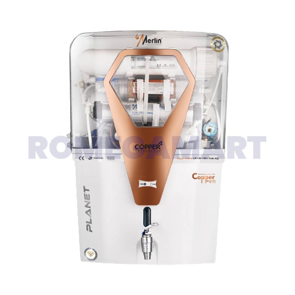 The Merlin Planet Transparent Copper White Water Purifier combines high-quality filtration with a modern, space-saving design. Featuring a 12-liter storage capacity, it ensures a continuous supply of purified water. The copper filtration system enhances water quality by removing impurities, while the transparent body provides a stylish view of the purification process. Designed for wall mounting, this purifier saves space and offers convenience, making it an ideal choice for any kitchen. Enjoy clean, safe drinking water with this sleek and functional water purifier.
