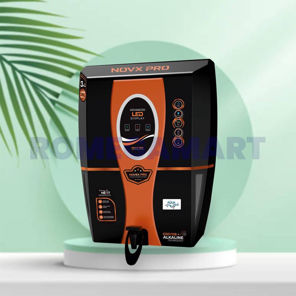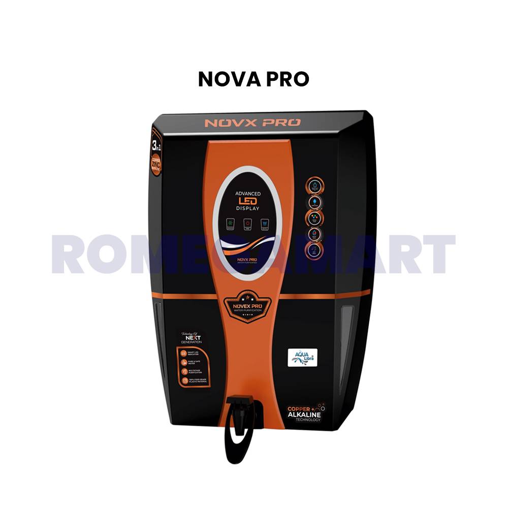 The Nova Pro Black Copper Water Purifier is an advanced water filtration system designed for modern homes. Featuring Zinc, Copper, and Alkaline technology, it effectively removes impurities while improving water quality. The stylish black and copper finish adds a premium look to your kitchen. With a 12-liter storage capacity, it ensures a steady supply of safe drinking water. Reliable, durable, and efficient, this purifier is an excellent investment for health and wellness.