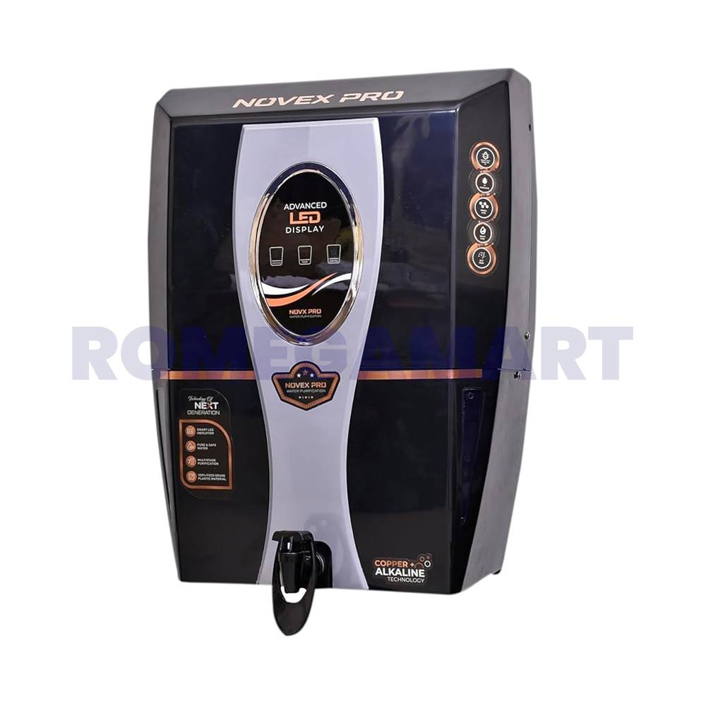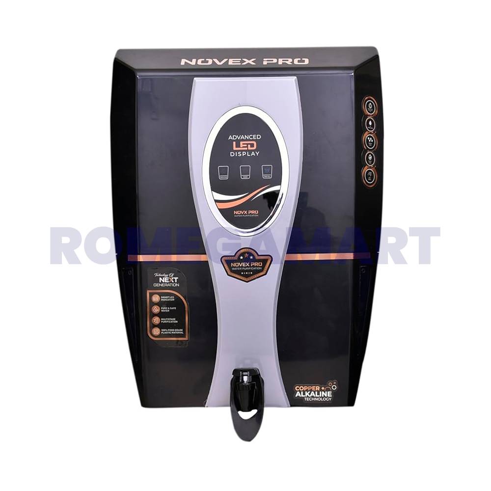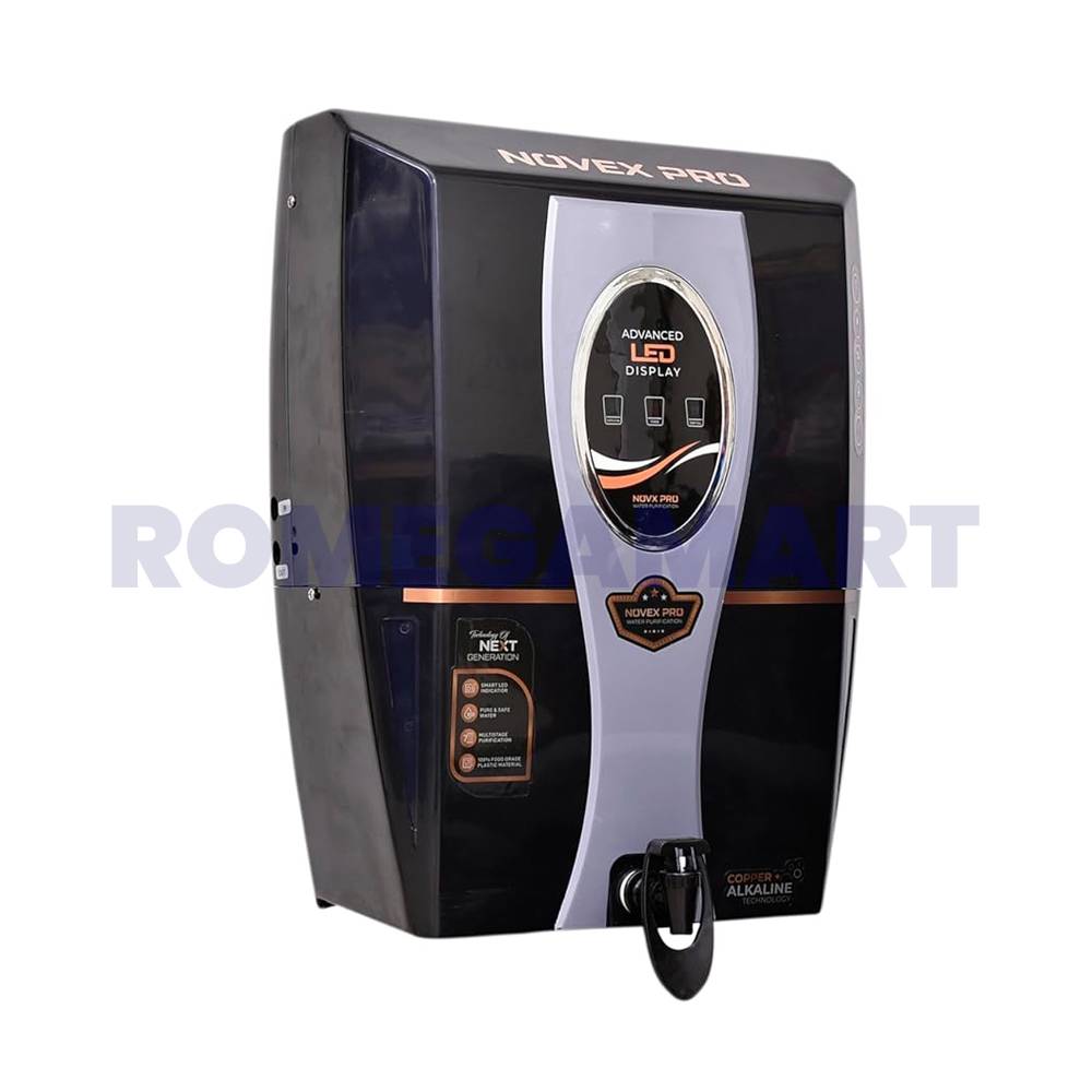 The Nova Pro Black Grey Water Purifier combines style and efficiency with its advanced filtration system. Using Zinc, Copper, and Alkaline technology, it ensures water is free from harmful impurities while retaining beneficial minerals. The 12-liter storage capacity provides ample purified water for daily use. Its black and grey design enhances the aesthetics of any kitchen while offering unmatched purification performance.