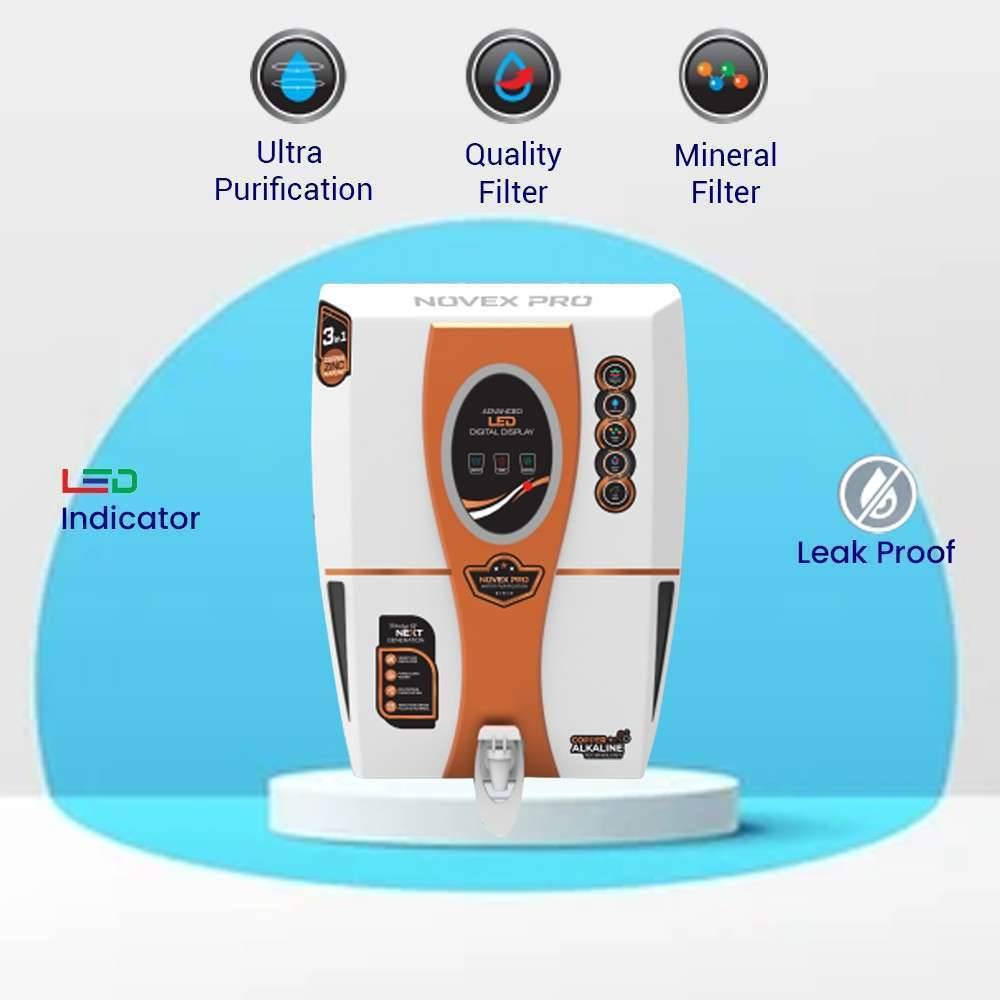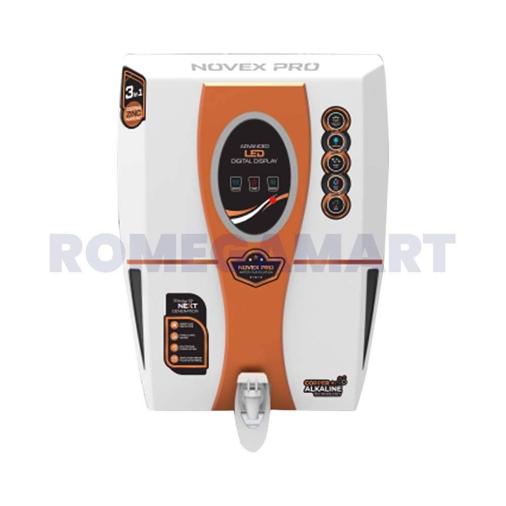 The Novex Pro White with Copper 10 Liter RO+UV+TDS+Copper Domestic Water Purifier features an advanced LED digital display and is crafted with food-grade materials for safety. With a comprehensive system incorporating RO, UV, and TDS technologies, along with copper elements, this purifier ensures reliable access to clean and healthy water. Elevate your water purification experience with Novex Pro, offering a perfect blend of technology, aesthetics, and food-grade material in an elegant white color with copper accents.