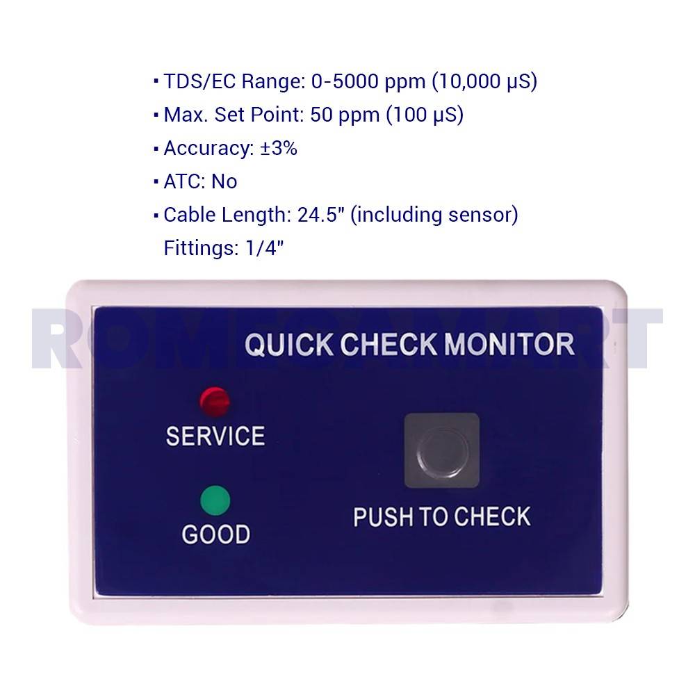 The QC-1 Quick Check TDS/Conductivity Monitor is a convenient and efficient device designed for quick measurement of Total Dissolved Solids (TDS) and conductivity in water. With its user-friendly design, this monitor provides rapid and accurate readings, allowing for easy assessment of water quality. Ideal for various applications including water purification, hydroponics, and aquariums, the QC-1 offers quick and reliable monitoring to ensure optimal water conditions. FEATURES: Eight programmable set points (by dip switch). Bright LED lights Simple to use – Quick Easy Installation Factory Calibrated to 100 ppm NaCl. Re-calibration is unnecessary. Comes equipped with one 1/4 inch T-fitting (also available in 3/8? or 1/2?) Excellent Reverse Osmosis (RO) or Deionization (DI) monitor
