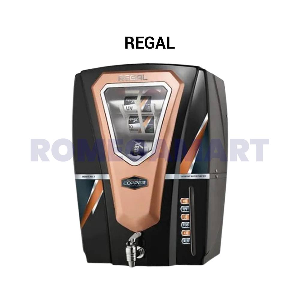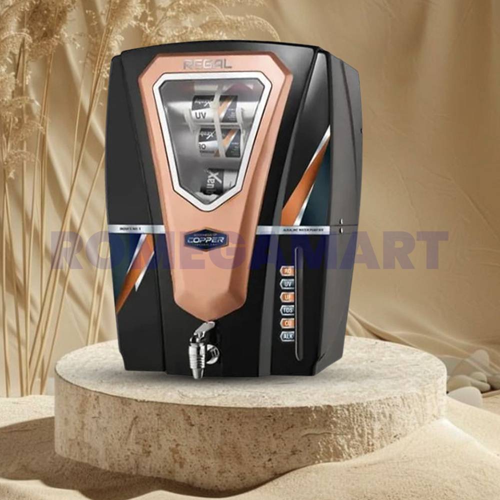 The Regal 12 Liter Storage RO Water Purifier in sleek black with copper accents is designed to deliver pure and safe drinking water for your home. With a 12-liter storage capacity, this advanced water purifier ensures you always have clean, purified water readily available. Equipped with RO filtration technology, it effectively removes impurities and harmful contaminants, providing fresh and healthy drinking water for domestic use. Its modern design, featuring copper elements, adds a touch of elegance to your kitchen while offering superior water purification for your family.