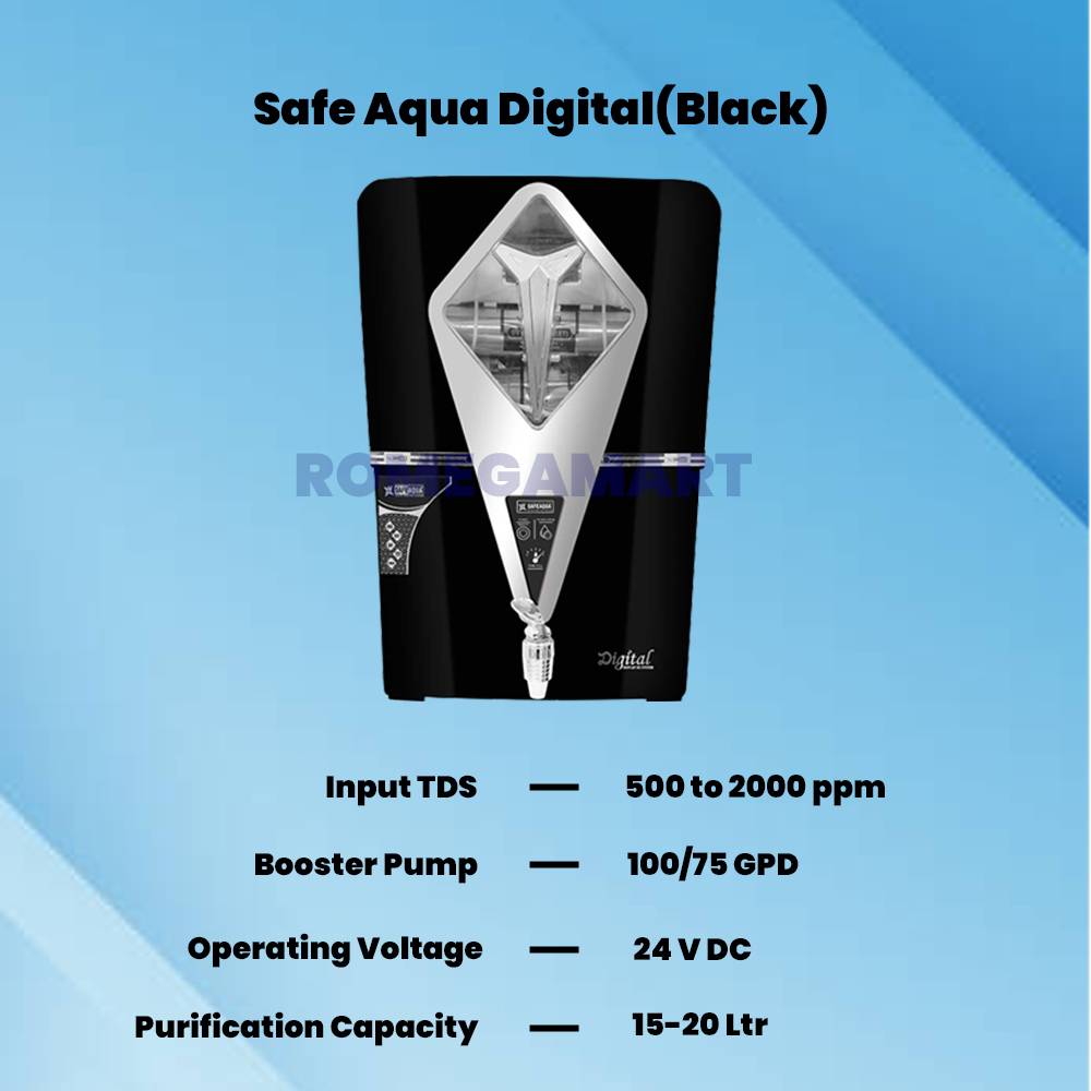 The Safe Aqua Digital Black 12 Liters Domestic RO System is a comprehensive water purification system designed to ensure clean and safe drinking water for domestic Water Filter use. It incorporates multiple purification technologies including RO (Reverse Osmosis), UV (Ultraviolet), UF (Ultrafiltration), TDS (Total Dissolved Solids) Control, and ALK (Alkaline) adjustment.