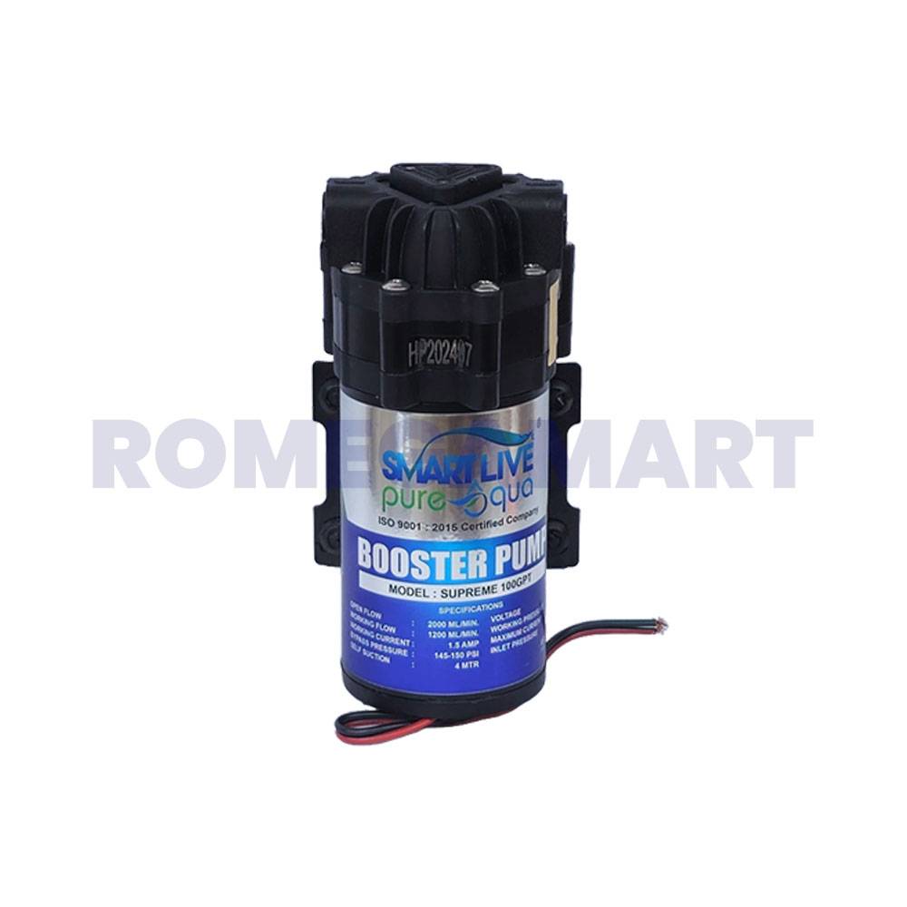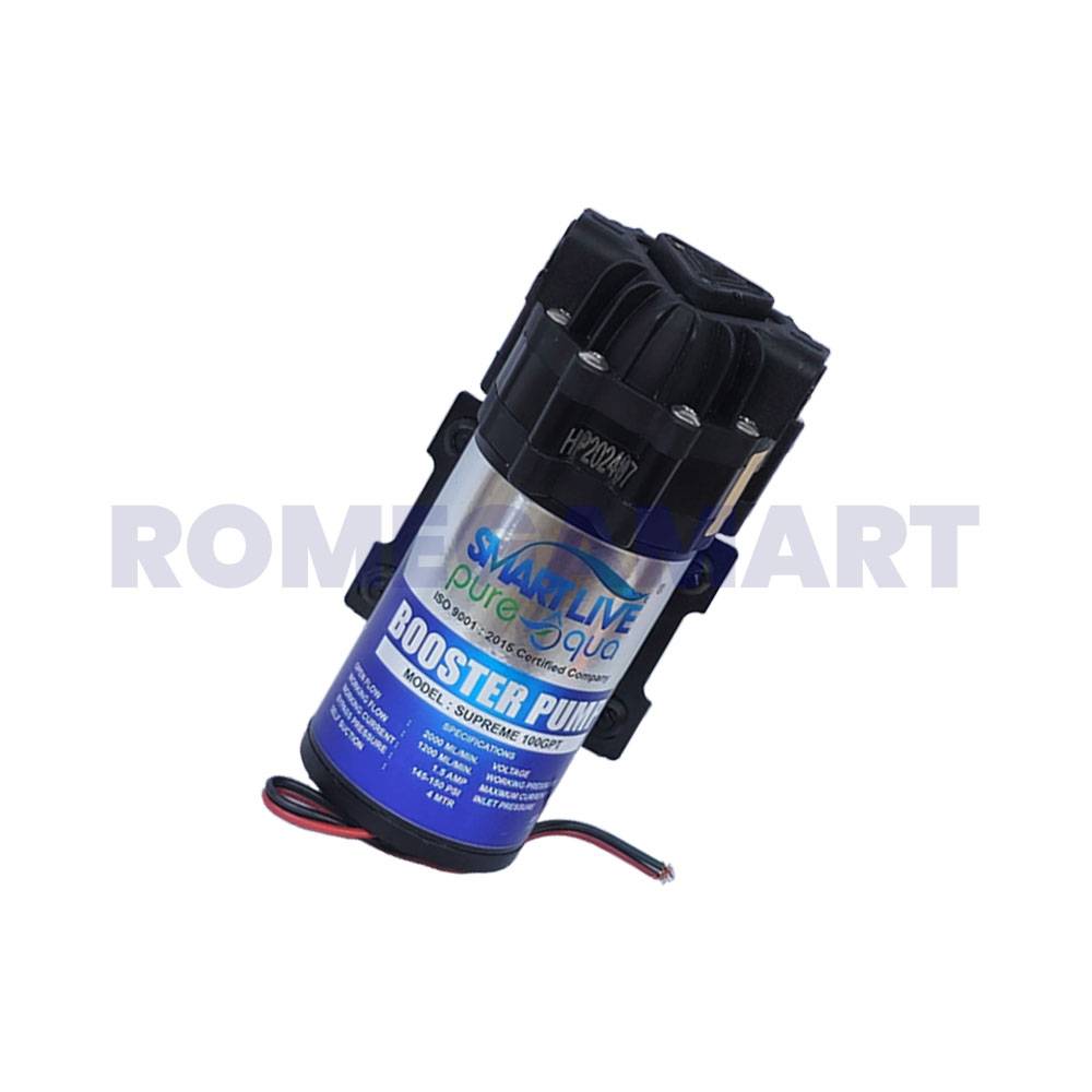 The Smart Live Pure Supreme 100 GPD Best Ro Booster Pump is a high-performance, 24V DC pump designed for domestic RO systems. It ensures optimal water pressure for enhanced filtration efficiency, delivering up to 100 gallons per day. Built with durable materials, it provides consistent performance while minimizing noise and energy consumption. Compact and reliable, this booster pump supports smooth operation in reverse osmosis systems, improving water quality and extending the system's lifespan. Ideal for residential use, it meets modern water purification needs with ease. Upgrade your RO system with the Smart Live Pure Supreme for a dependable and efficient water purification experience.