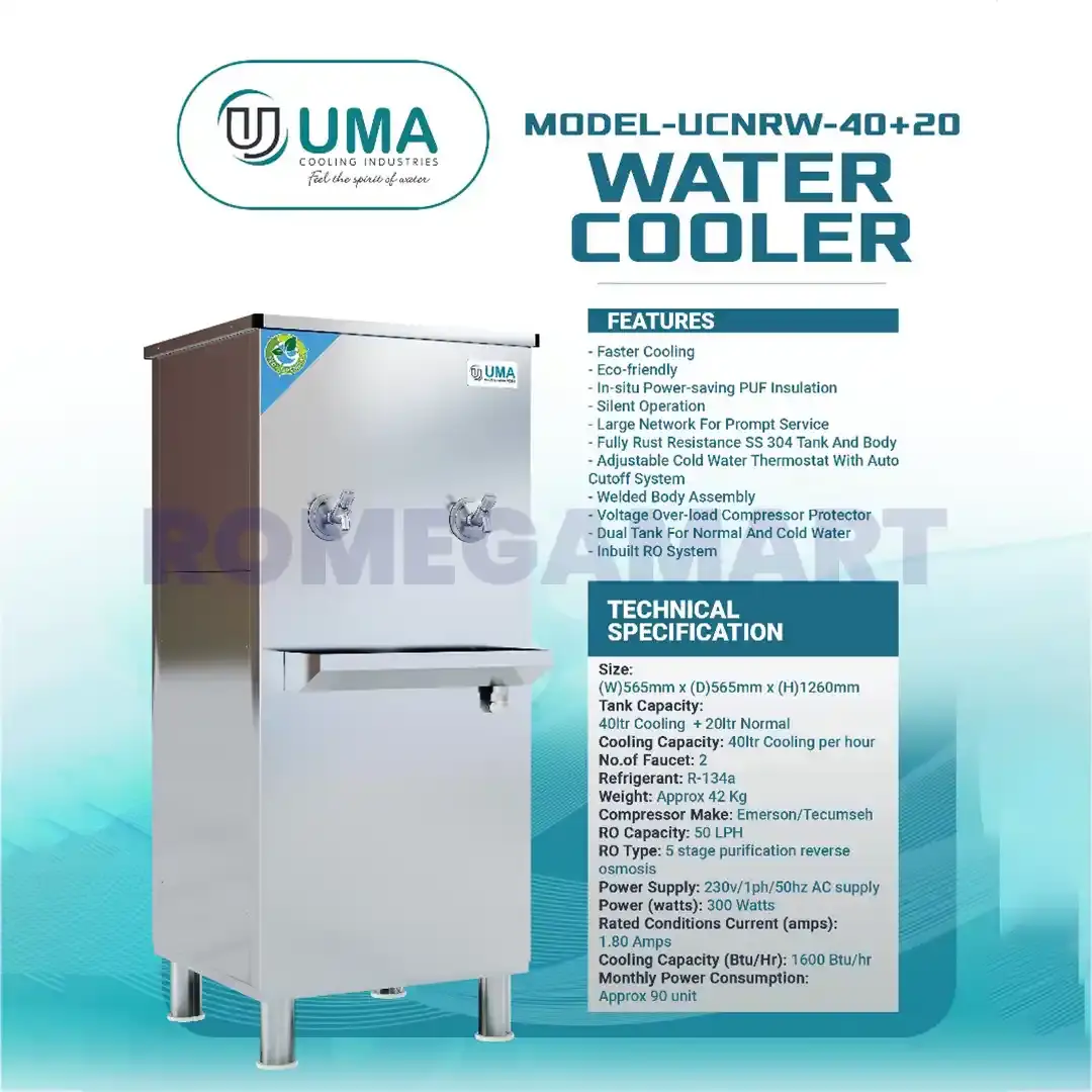 The UMA UCNRW-40+20L 2 Tap Water Cooler provides reliability, superior cooling, and long-lasting build quality — all available at the best wholesale price on Romegamart.