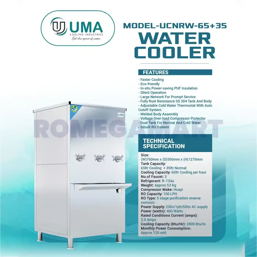 The UMA UCNRW-65+35 Liter Storage 3 Tap Water Cooler is a high-capacity stainless steel water cooling system engineered for consistent performance and long-lasting durability. With a total 100-liter (65L + 35L) dual storage design and 3 efficient taps, it ensures a steady flow of chilled water, making it ideal for schools, offices, hospitals, factories, and public institutions.