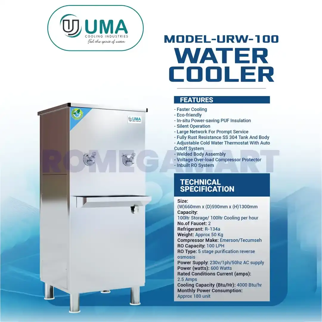 Stay hydrated with the UMA URW-100 Liter Water Cooler, designed for efficiency, hygiene, and long-lasting performance. Crafted from premium stainless steel with a sleek silver finish, this 2-tap water cooler offers durability and style for any environment. With its 100-liter storage capacity, it’s perfect for offices, schools, factories, and medium-sized commercial spaces. The dual-tap system provides both chilled and normal water options for convenient use. Built for energy efficiency and easy maintenance, the UMA URW-100 Liter Water Cooler delivers a continuous supply of clean, cool water — reliable, sturdy, and ideal for daily use.