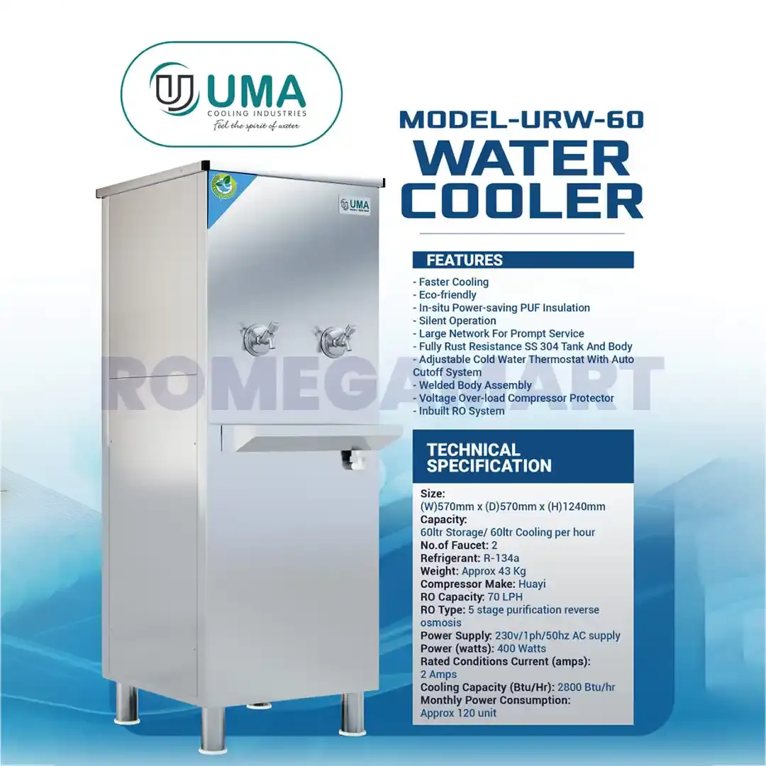 Keep your space refreshed with the UMA URW-60 Liter Water Cooler, crafted for durability, hygiene, and convenience. Made from high-quality stainless steel with a sleek silver finish, this 2-tap water cooler provides easy access to chilled and normal water. With a 60-liter storage capacity, it is ideal for small to medium offices, shops, and homes. Designed for energy efficiency and long-lasting performance, the UMA URW-60 Liter Water Cooler delivers clean, safe, and refreshing water every day — a reliable and stylish hydration solution.