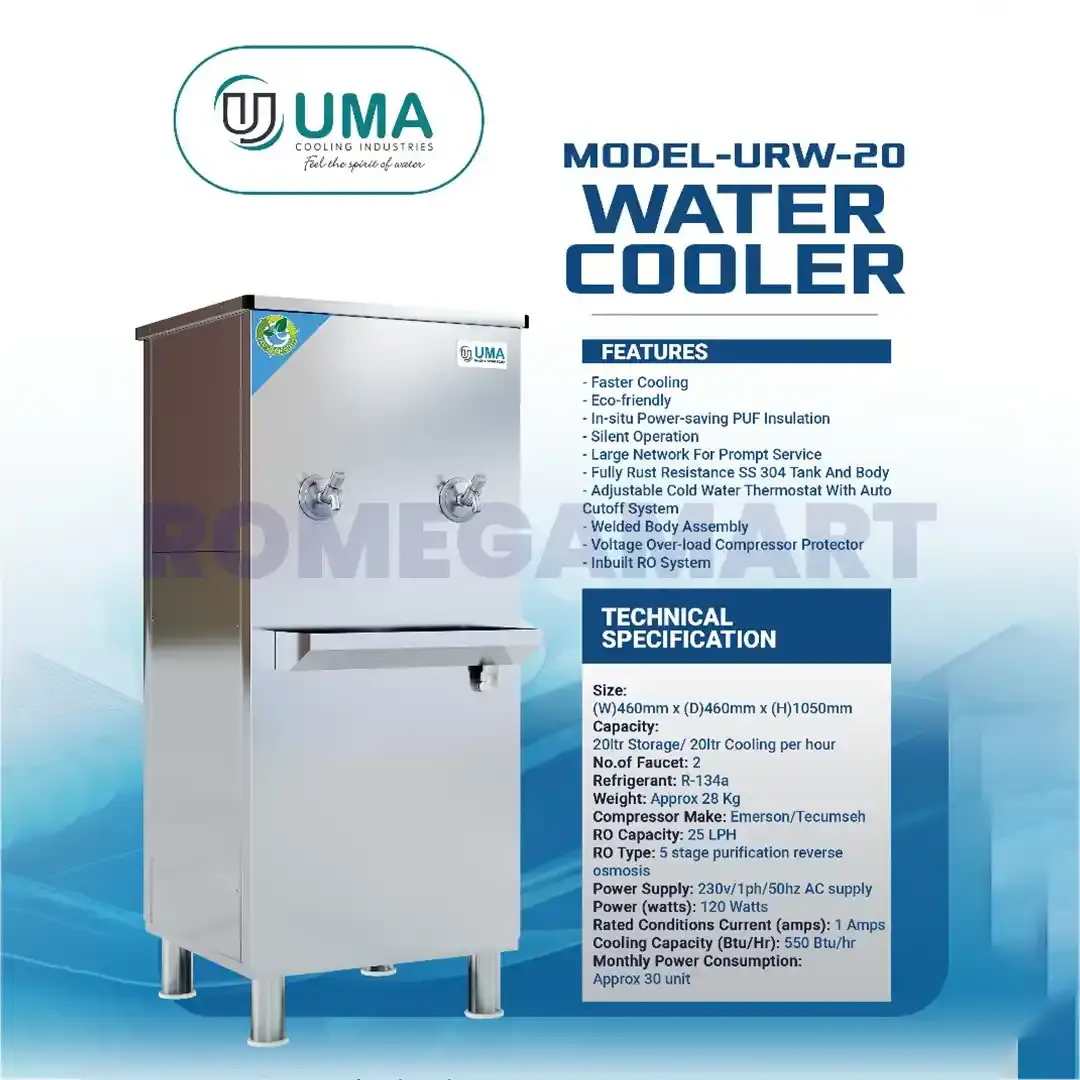 Stay cool and hydrated with the UMA USW-20 Liter Water Cooler, designed for compact spaces and efficient cooling. Built from high-grade stainless steel in a sleek silver finish, this 1-tap water cooler ensures long-lasting durability, hygiene, and style. With a 20-liter storage capacity, it’s perfect for homes, small offices, and shops. The sturdy stainless steel body resists corrosion and keeps water pure and fresh. Offering fast cooling performance and energy efficiency, the UMA USW-20 Liter Water Cooler delivers clean, chilled water whenever you need it — compact, reliable, and affordable.