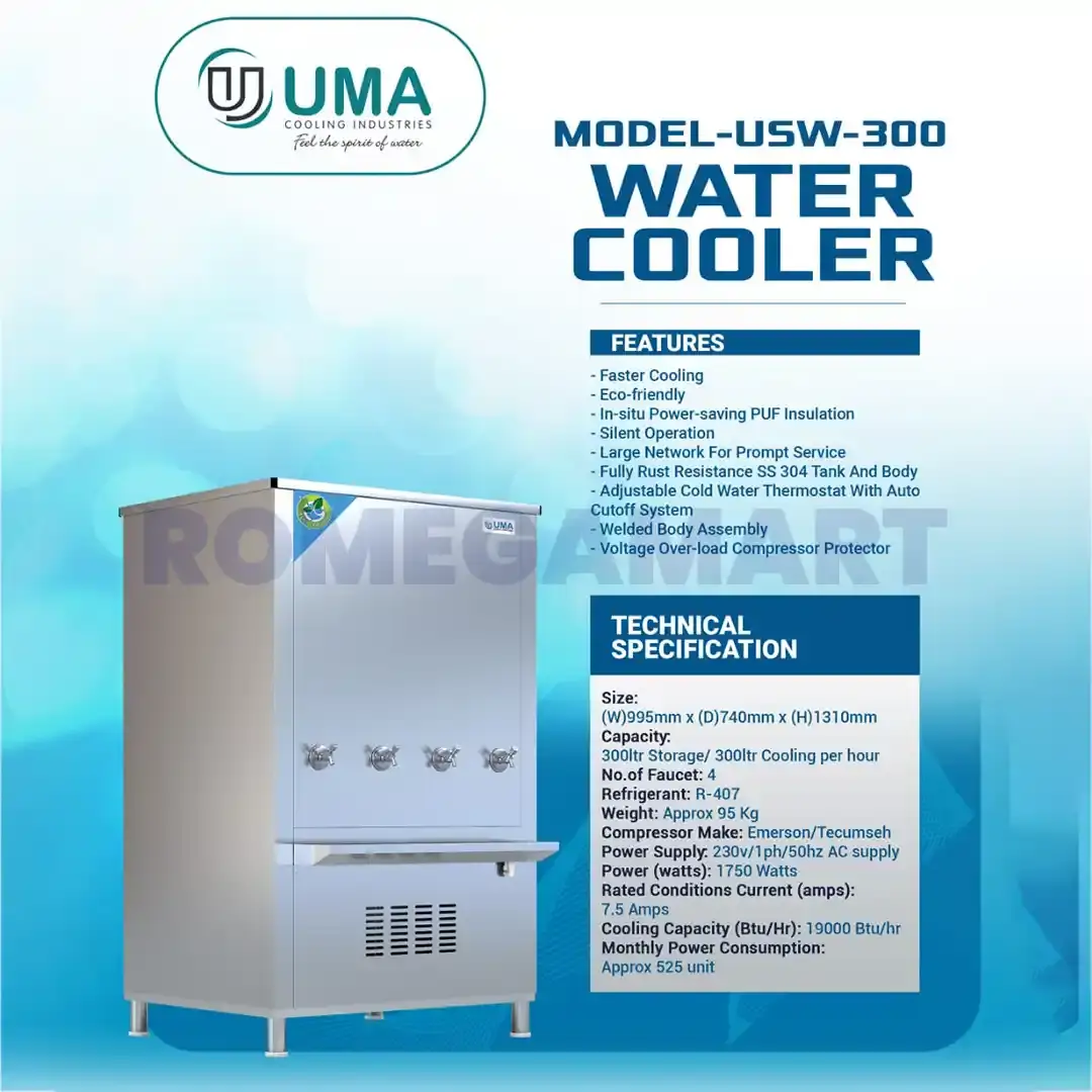 Experience high-capacity cooling with the UMA USW-300 Liter Water Cooler, built for heavy-duty use in commercial and industrial spaces. Crafted from premium stainless steel in an elegant silver finish, this 4-tap water cooler ensures strength, hygiene, and durability. With its massive 300-liter storage capacity, it easily serves large offices, schools, factories, and events. The 4 taps provide quick access to chilled and normal water simultaneously. Designed for performance and efficiency, the UMA USW-300 Liter Water Cooler delivers clean, refreshing water all day — a reliable, long-lasting, and cost-effective cooling solution.