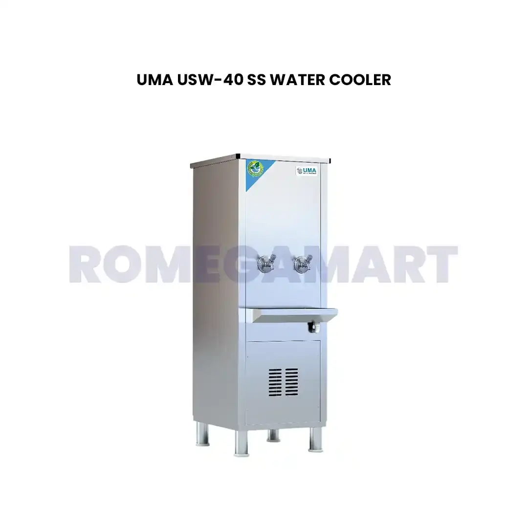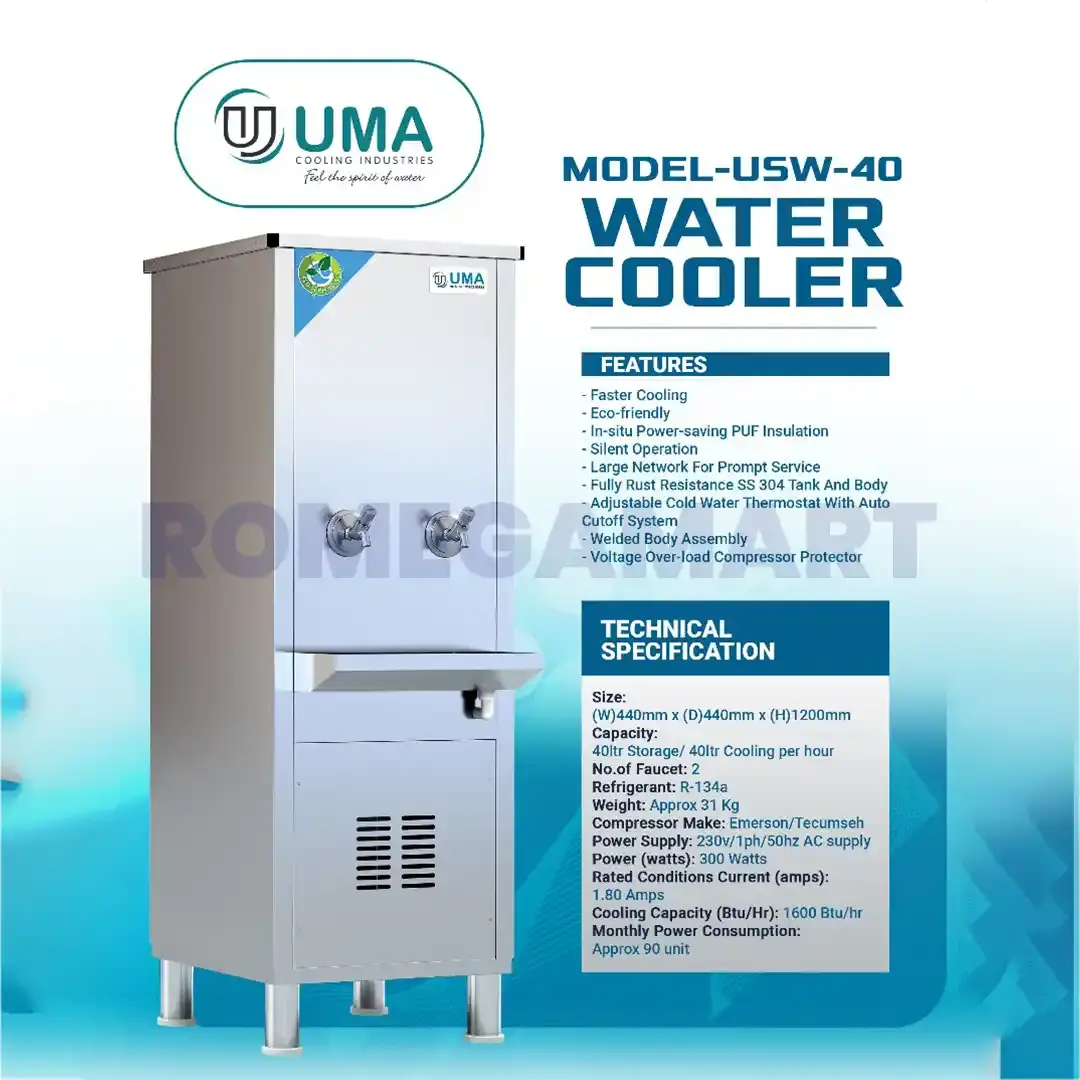 Stay refreshed every day with the UMA USW-40 Liter Water Cooler by UMA Cooling Industries. Crafted from premium-grade stainless steel with a modern silver finish, this 2-tap water cooler offers both durability and hygiene. Its 40-liter storage capacity makes it ideal for offices, schools, shops, and small commercial spaces. The double-tap design allows easy access to chilled and normal water simultaneously, ensuring convenience for multiple users. Designed for energy efficiency and long-lasting performance, the UMA USW-40 Liter Water Cooler combines style, strength, and superior cooling for your daily hydration needs.
