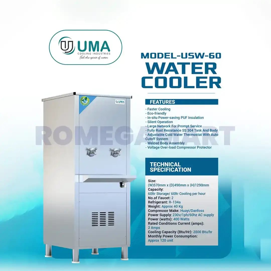 Keep your water chilled and accessible with the UMA USW-60 Liter Water Cooler. Crafted from high-quality stainless steel, this 2-tap water cooler offers durability and hygiene for everyday use. Its spacious 60-liter storage capacity is ideal for offices, schools, and large gatherings. The dual taps provide convenient access to chilled and room-temperature water simultaneously. Sleek, modern, and efficient, the UMA USW-60 Liter Water Cooler ensures safe, refreshing water for everyone. Reliable, affordable, and built to last – a must-have water solution for any space.