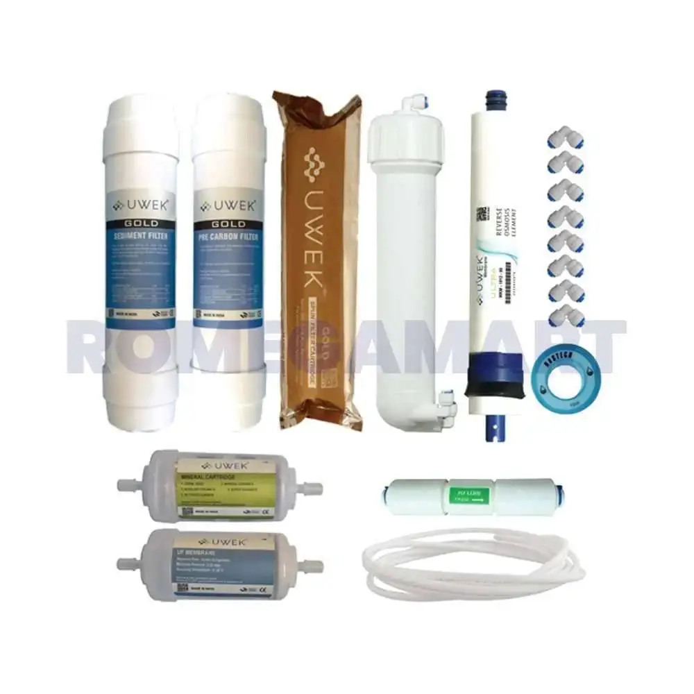 The UWEK RO Service Kit is a comprehensive maintenance service kit designed for 80 GPD (gallons per day) RO (Reverse Osmosis) water purifiers. This combo pack includes essential components for ensuring the optimal performance and longevity of your RO water purifier. The RO Reverse Osmosis Filter delivers clean, safe drinking water for your home. The kit typically contains pre-filters, sediment filters, carbon filters, a post-carbon filter, and a membrane, along with necessary O-rings and fittings. It is suitable for routine maintenance and replacement of worn-out parts, helping to maintain high water quality and system efficiency. Ideal for household and commercial RO water purifiers.