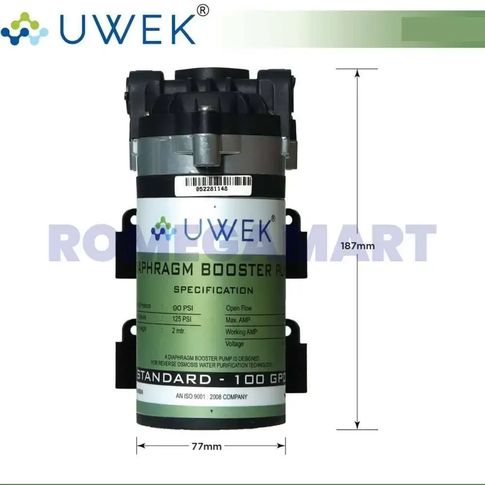 The UWEK Standard 100 GPD Reverse Osmosis Booster Pump Combo Pack includes a 24V SMPS and SV elbow connector, designed for domestic RO systems. This comprehensive set boosts water pressure, ensures a stable power supply, and provides secure connections, enhancing the efficiency and performance of your home water purification system. Easy to install, it guarantees clean and safe drinking water for your household.