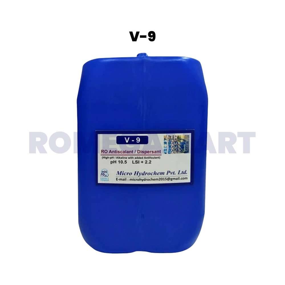 V-9 RO Antiscalant Dispersant is a highly effective solution designed to prevent scaling and disperse particulates in reverse osmosis systems. With a pH of 10.5 and LSI of +2.2, this 5 KG drum from Micro Hydrochem Pvt Ltd ensures superior protection for industrial RO membranes, enhancing efficiency and lifespan.