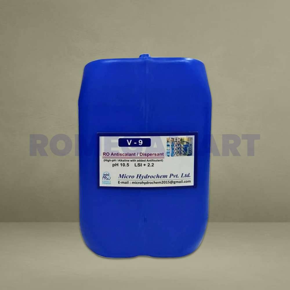 V-9 RO Antiscalant Dispersant is a highly effective solution designed to prevent scaling and disperse particulates in reverse osmosis systems. With a pH of 10.5 and LSI of +2.2, this 50 KG drum from Micro Hydrochem Pvt Ltd ensures superior protection for industrial RO membranes, enhancing efficiency and lifespan.