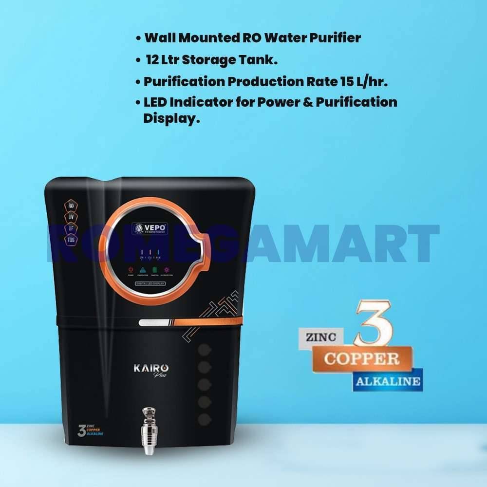 Vepo Kairo Plus 12 Liter Storage Water Purifier Black Color RO+UV+UF+TDS+Zinc+Copper And Alkaline - PRUDENCE MARKETING PRIVATE LIMITED