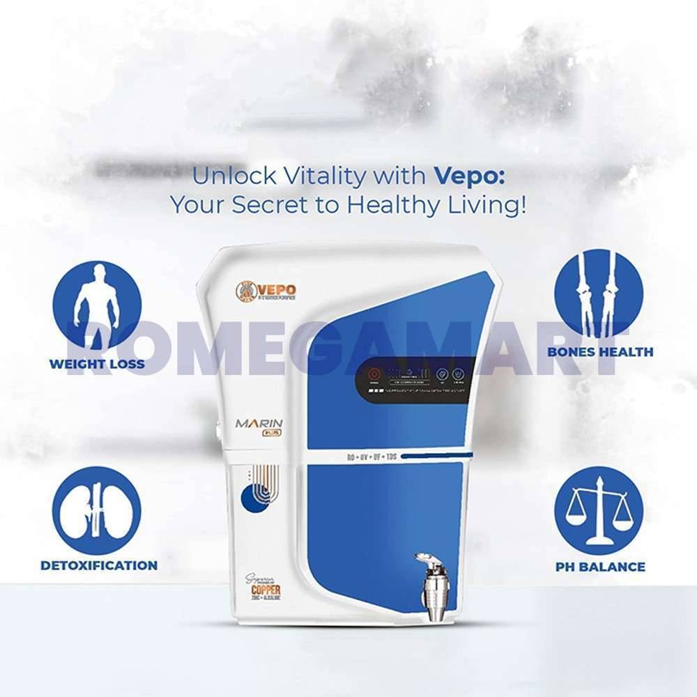 The Vepo Marin Plus in white with blue accents is a stylish and efficient 18-liter storage water purifier. Utilizing Zinc, Copper, and Alkaline technology, it guarantees thorough purification while enriching the water with essential minerals for improved health benefits. Perfect for households or offices, this purifier ensures a constant supply of clean and refreshing drinking water.