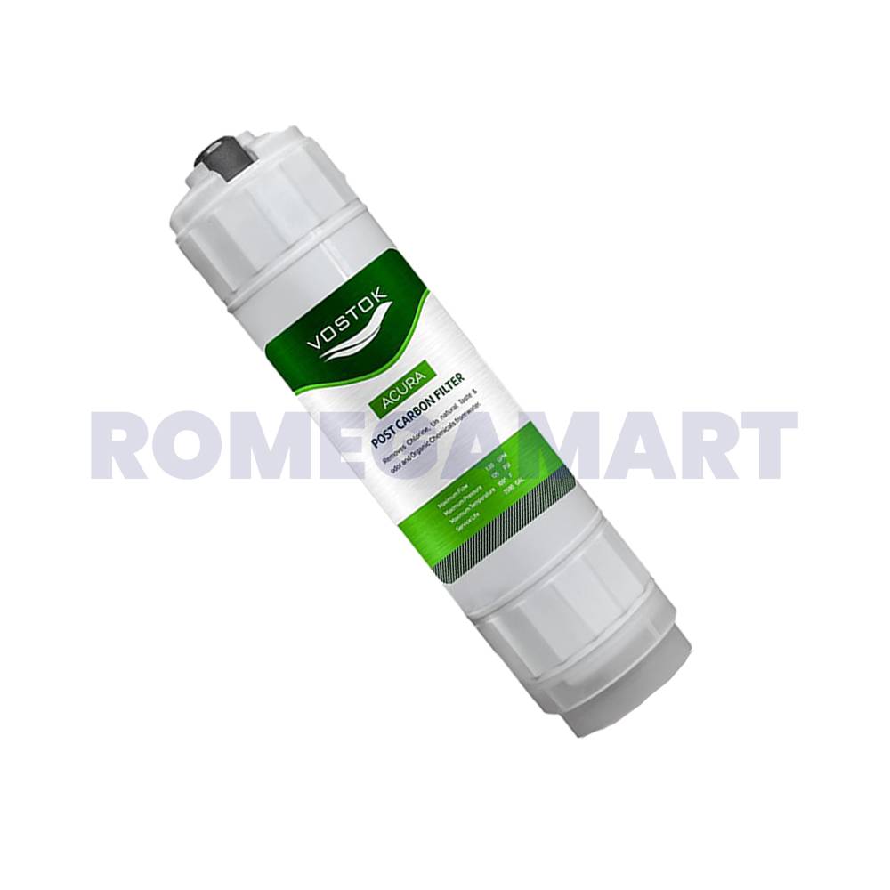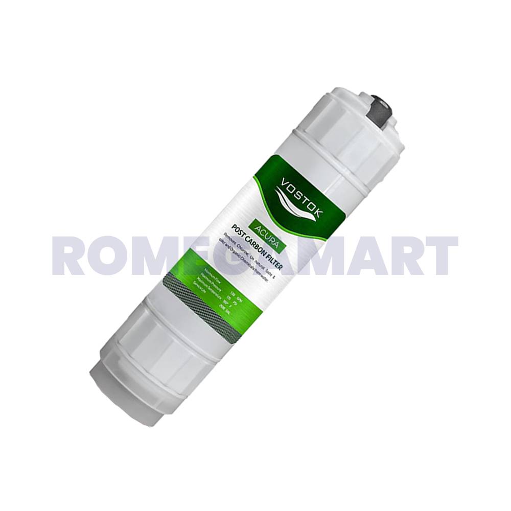 The Vostok Acura Post Carbon Block Filter CTO is a premium filtration component designed for domestic reverse osmosis (RO) systems. Featuring an attractive white and green color combination, this filter is engineered to effectively remove chlorine, odors, and other organic contaminants, enhancing the taste and quality of your water. Easy to install and maintain, it offers reliable and long-lasting performance. As a vital part of the final stage of water purification, this filter ensures that the water in your home is clean, fresh, and free of any unpleasant aftertaste, making it perfect for everyday use in domestic RO systems.