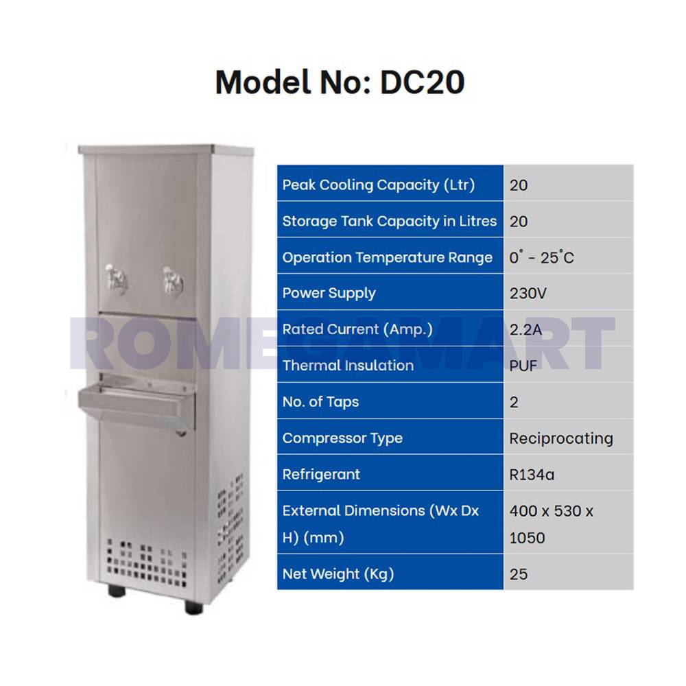 The Water Cooler SS Model DC 20 by Manyug Enterprises is a durable and efficient cooling solution designed for homes, offices, and industrial spaces. Built with high-quality stainless steel, this silver-colored water cooler ensures long-lasting performance, rust resistance, and a sleek, modern look. Its large capacity and energy-efficient cooling system provide consistently chilled water for all-day refreshment. Perfect for high-traffic areas, the DC 20 model offers reliable cooling at an affordable price.